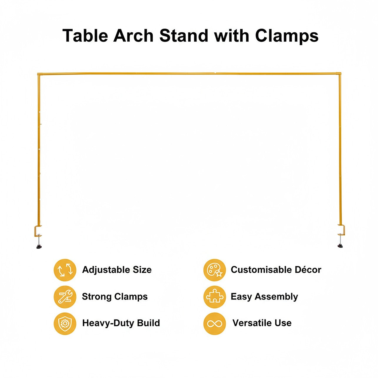 Transform any occasion into a breathtaking celebration with this adjustable over-the-table arch stand with clamps. Designed to fit most tables, this sturdy and versatile stand makes it easy to hang balloons, flowers, greenery, lights, or garlands to create unforgettable backdrops. Perfect for weddings, birthdays, holiday events, and parties, it's built with durable square metal tubing for extra stability and effortless style.