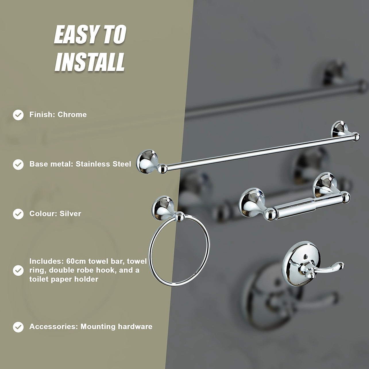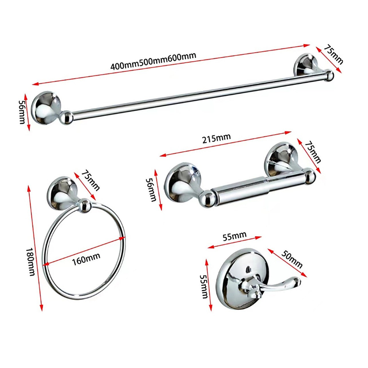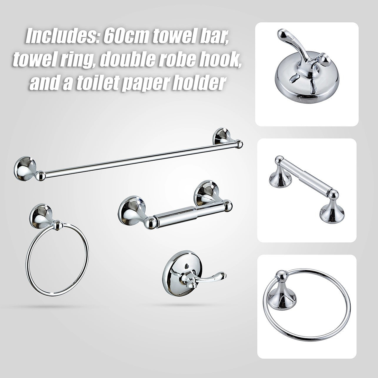 - Includes: 60cm towel bar, towel ring, double robe hook, and a toilet paper holder