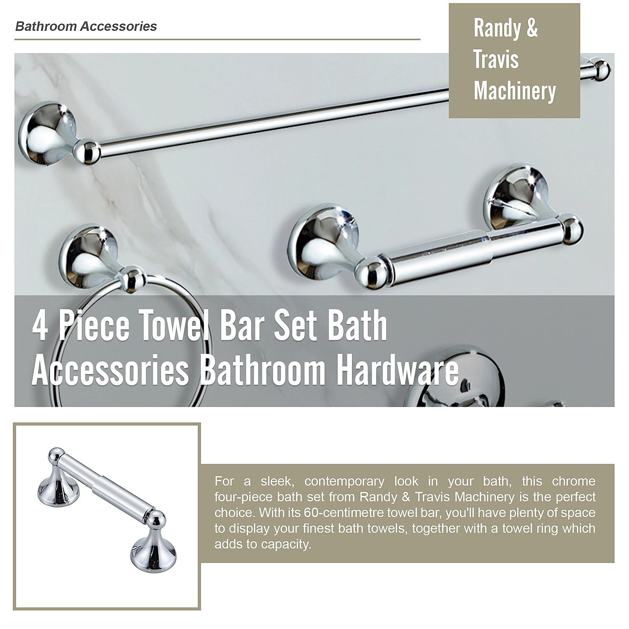For a sleek, contemporary look in your bath, this chrome four-piece bath set from Randy & Travis Machinery is the perfect choice. With its 60-centimetre towel bar, you'll have plenty of space to display your finest bath towels, together with a towel ring which adds to capacity. A double robe hook and a wall-mounted toilet paper holder complete the set.