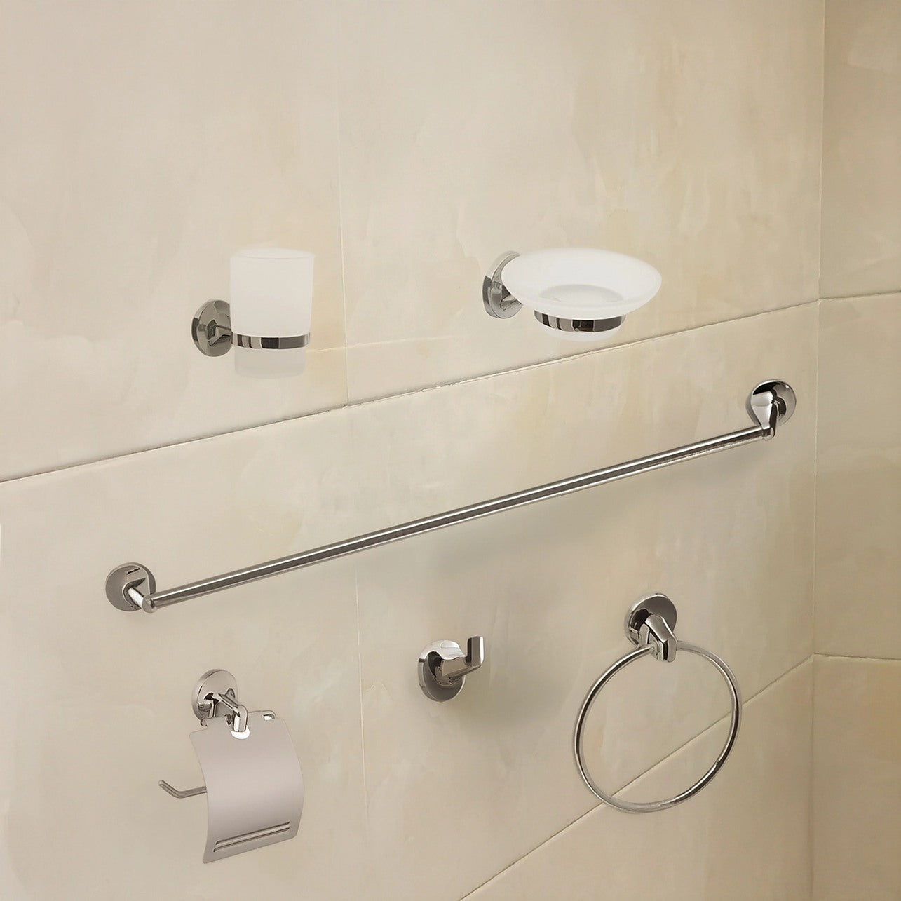 This premium bathroom basin accessory kit features a comprehensive selection that includes the frosted tumbler glass for toothbrushes, a frosted soap dish, a towel ring, a towel rail, a robe hook, and a toilet roll holder with a cover. These six individual accessories perfectly complement each other, creating a cohesive and stylish chrome bathroom set.