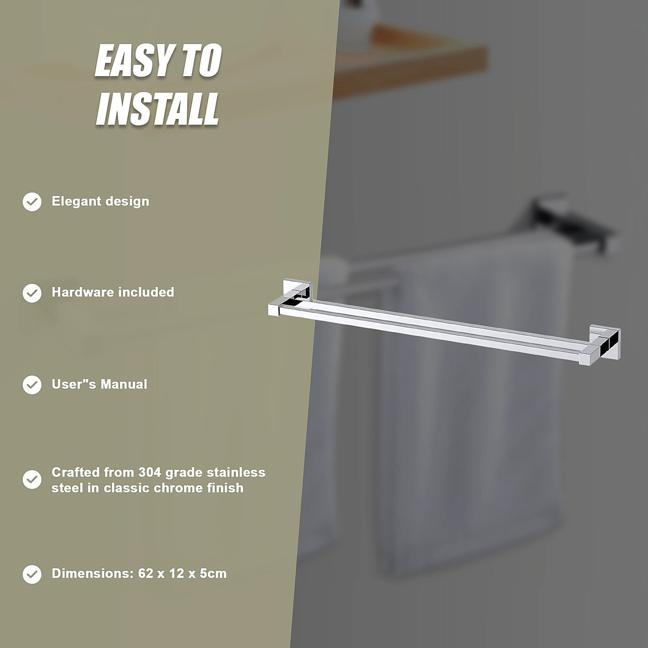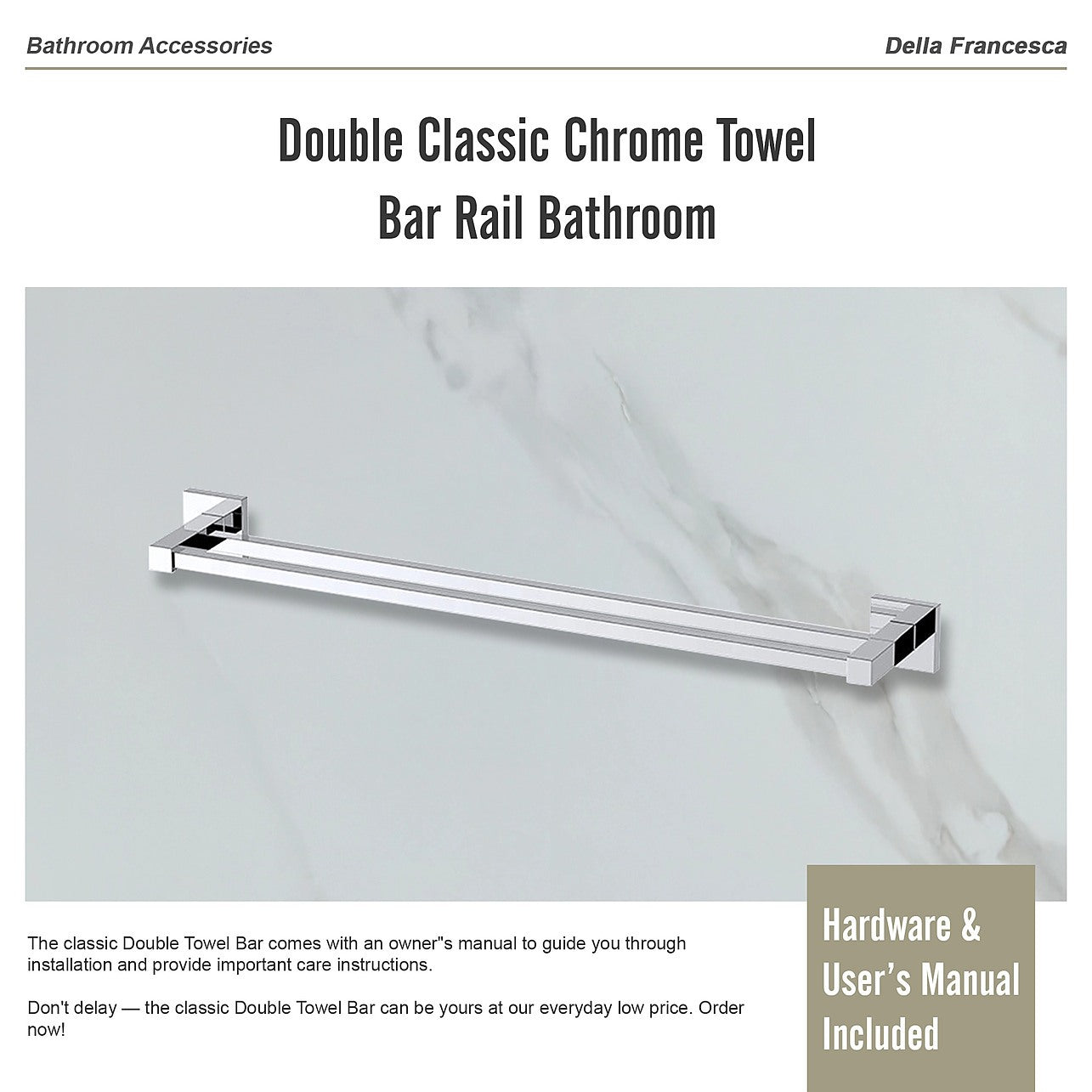 The towel bar will be an attractive addition to your bathroom. You can't go wrong with this classic look which will keep its appeal for years to come. Installation is easy and all mounting accessories - including mounting parts and install screw - are included. The classic Double Towel Bar comes with an owner"s manual to guide you through installation and provide important care instructions.