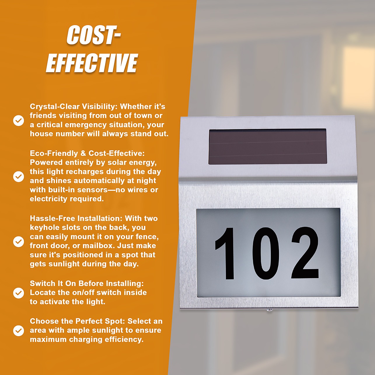 Upgrade your home's curb appeal and functionality with this must-have solar-powered house number light. Get yours today and never be hard to find again!