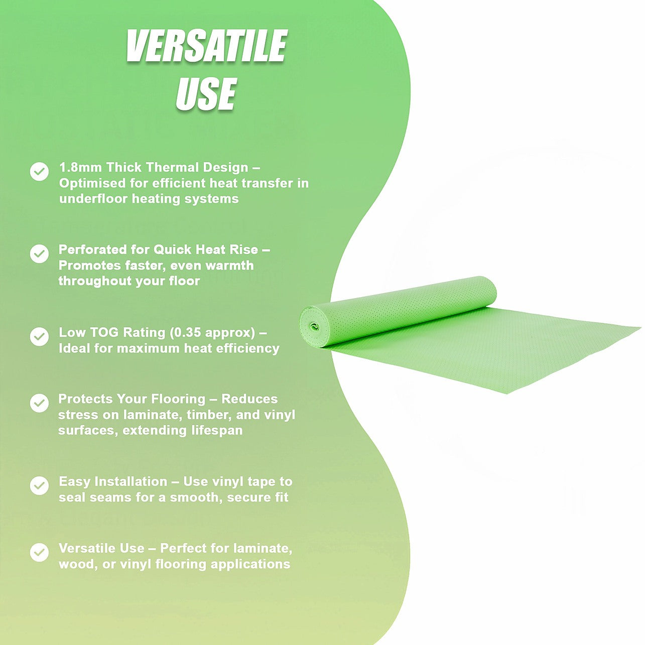 Enhance your home's comfort and energy efficiency with the Quick Thermal Underfloor Heating Underlay, designed for laminate, timber, and vinyl flooring. Engineered for superior heat transfer and sound reduction, this premium 1.8mm underlay helps you achieve faster, more even warmth across your floors while protecting them from long-term wear.