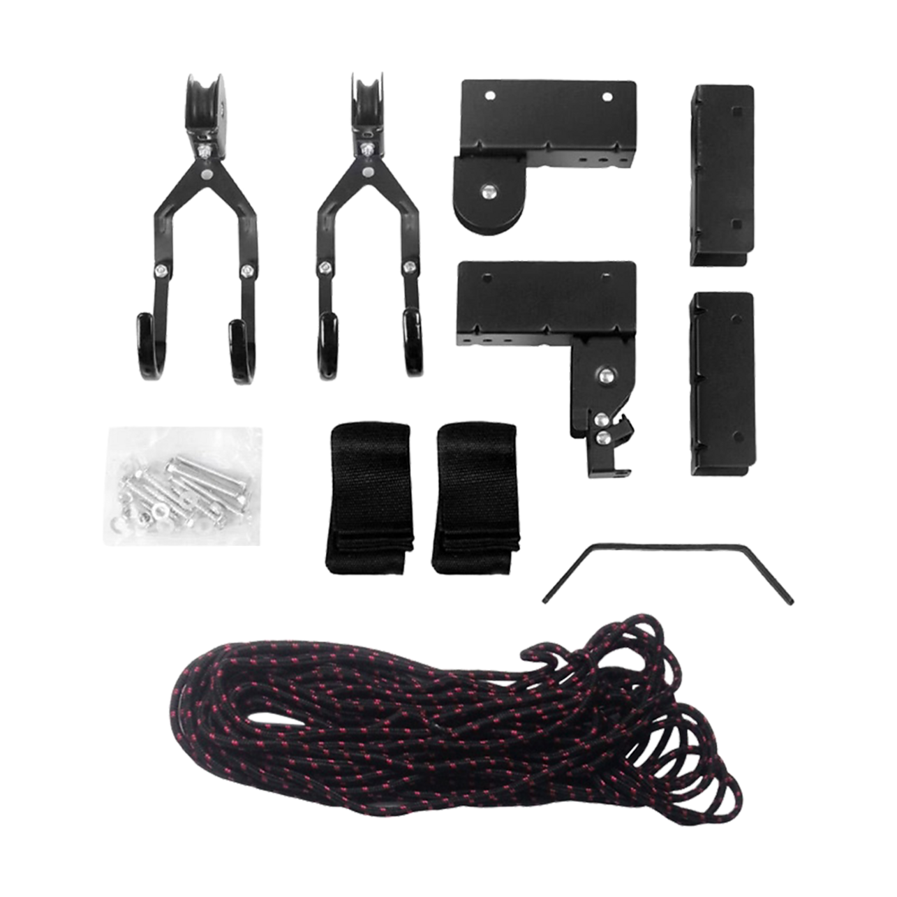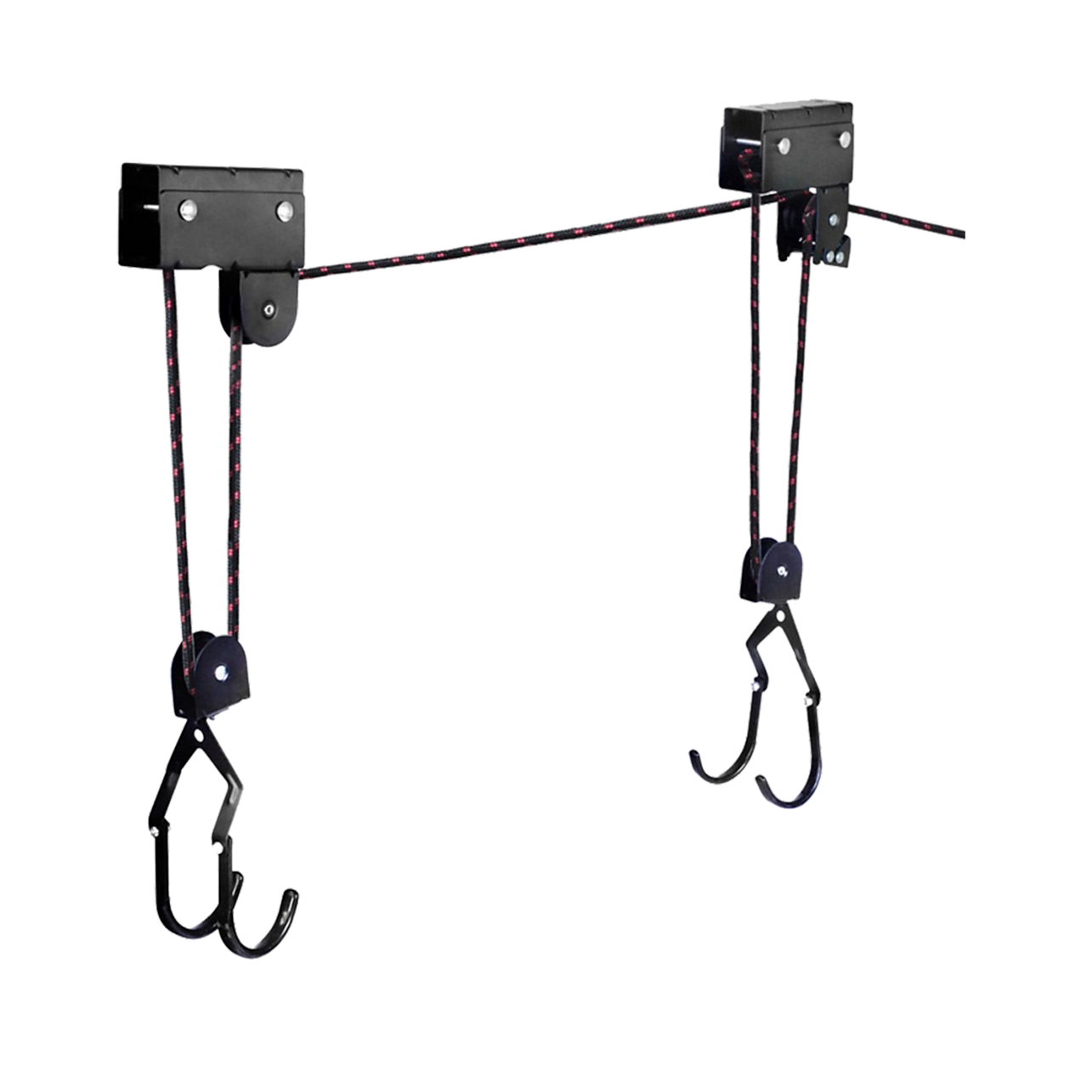 Maximise your garage or shed space with this Heavy Duty Bike Hoist Pulley Lift, designed to safely raise bicycles overhead and keep your floor clutter-free. Built from high-carbon steel with a sleek black finish, this ceiling-mounted system supports mountain bikes, road bikes, kids' bikes, folding bikes and more — and it also works perfectly for ladders, benches, and storage nets.