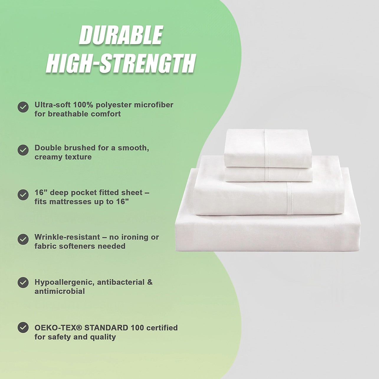 Upgrade your sleep with the Double 1800 Series Microfiber Bed Sheet Set in elegant white. Crafted from premium double-brushed microfiber yarns, these sheets deliver a luxuriously soft feel with enhanced breathability and durability. The 16-inch deep-pocket fitted sheet ensures a snug fit on most mattresses, while the wrinkle-resistant design eliminates the need for ironing or fabric softeners.
