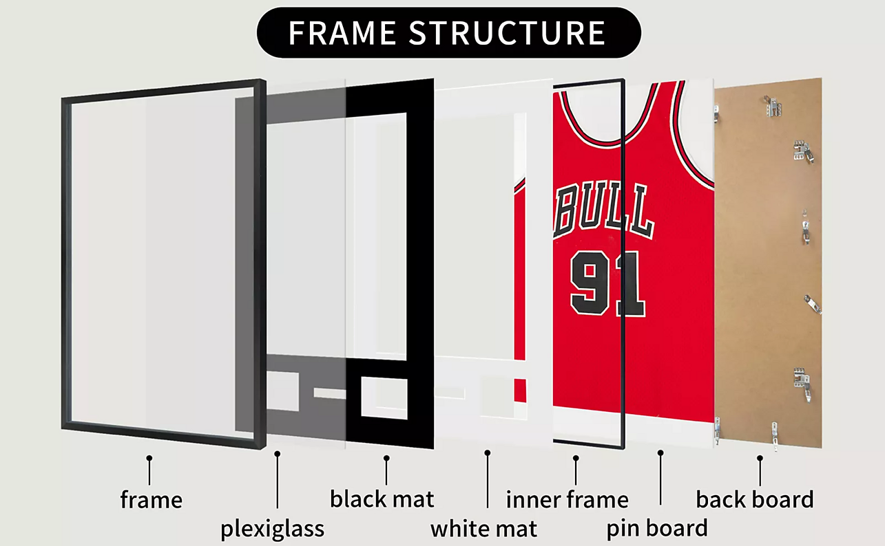 - A pin board ensures a wrinkle-free, tight display ideal for long-sleeved jerseys such as football and hockey shirts.