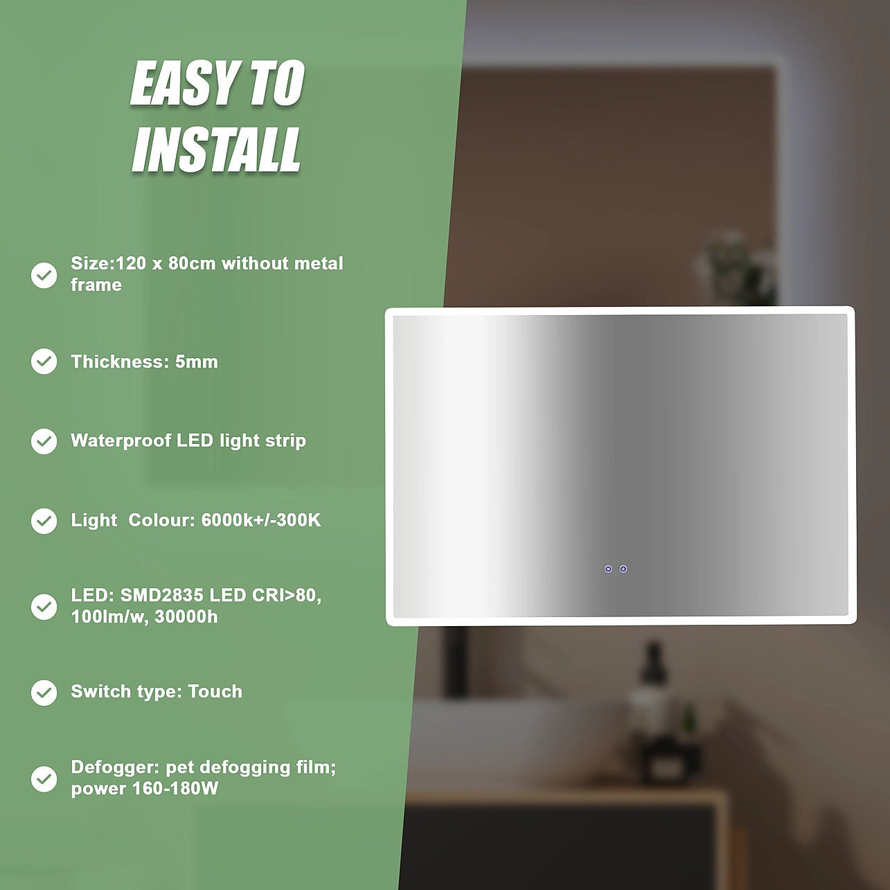 Rectangular LED Mirror with Anti-Fog – Illuminated Bathroom & Living Room Design 120 x 80cm