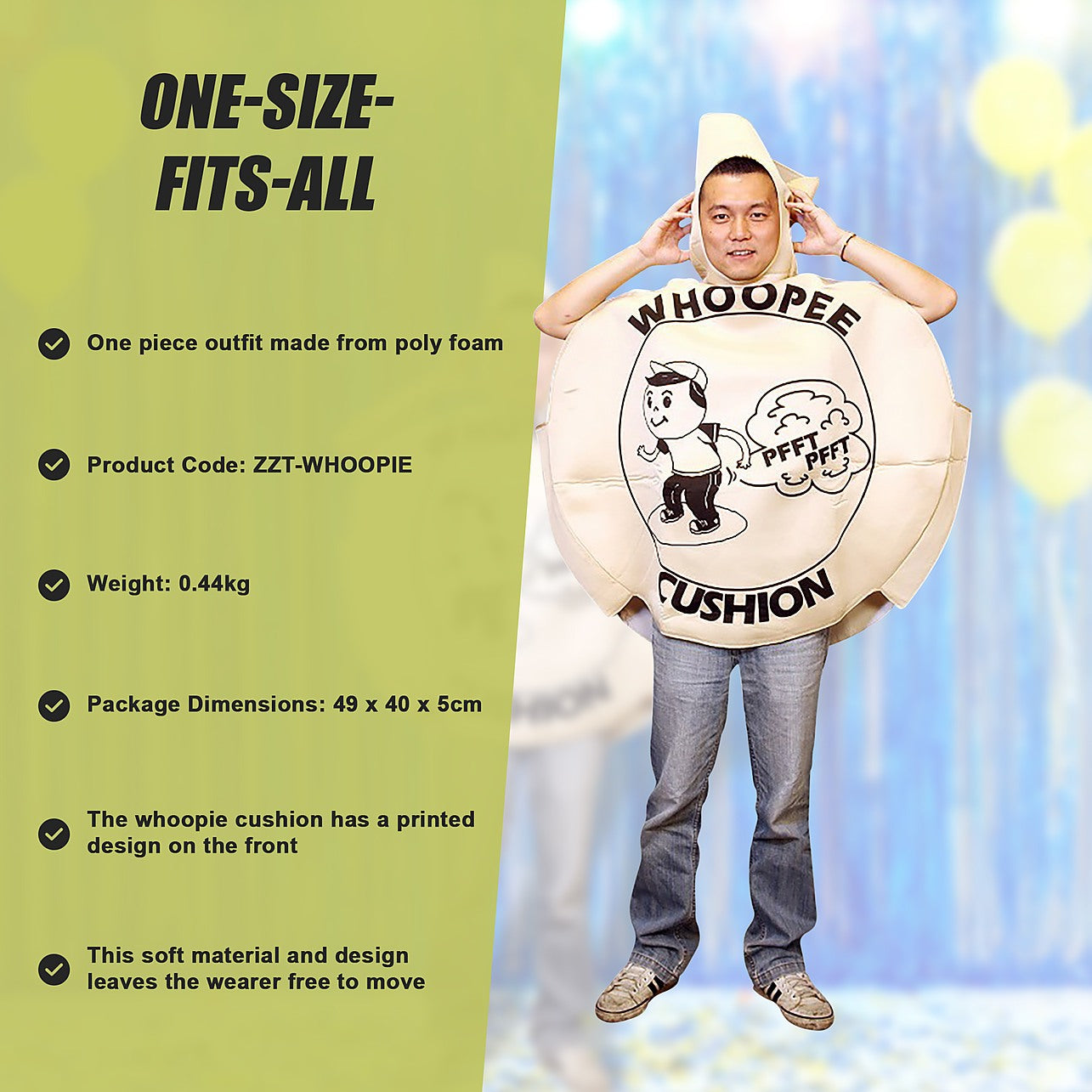 You"ll be sure to leave a memorable impression when you appear at the party dressed as a walking-talking Whoopie Cushion! This fun Whoopie Cushion Costume is adult-sized, easy to slip on and comfortable to wear. There are generous-sized slots for your arms so you are not confined in the least.