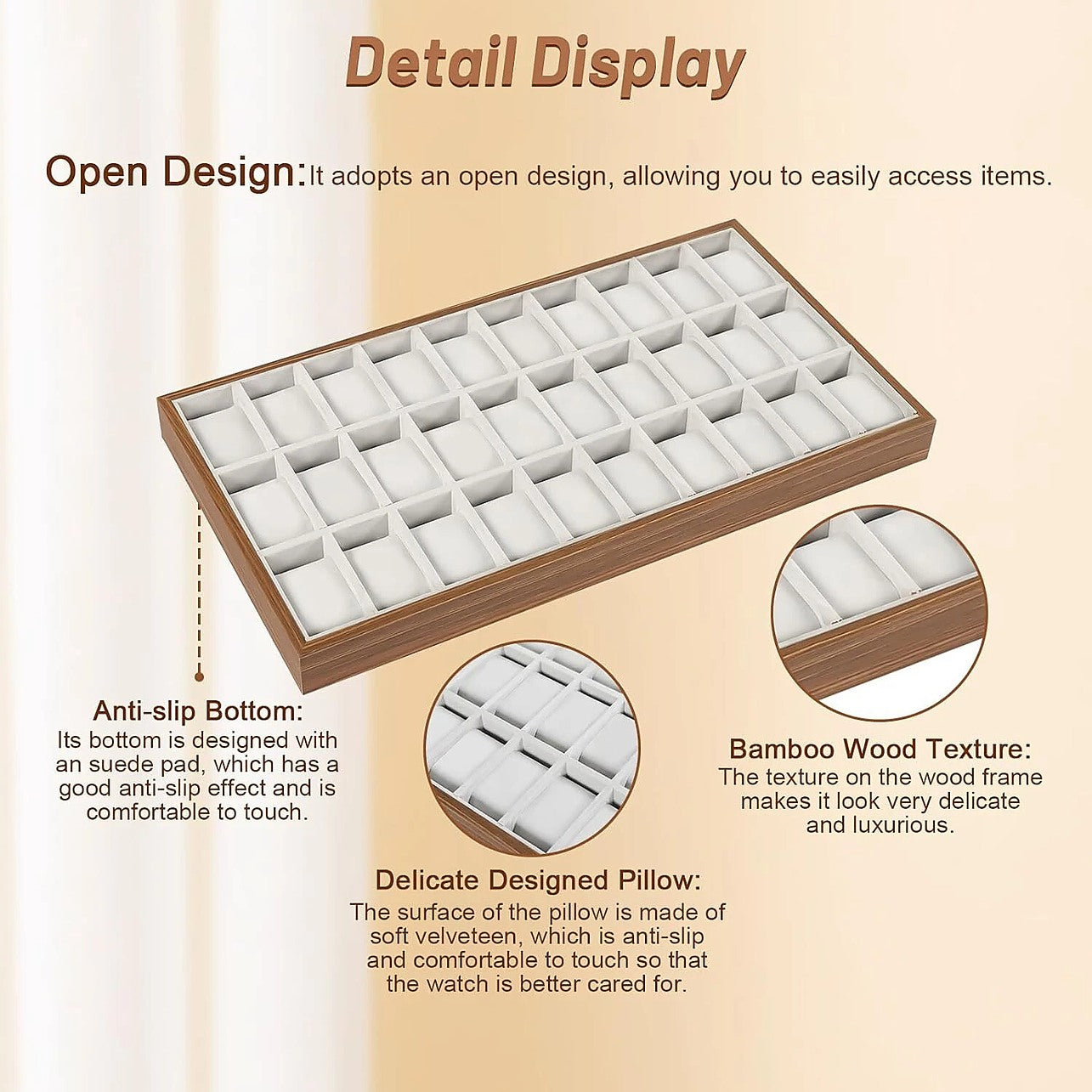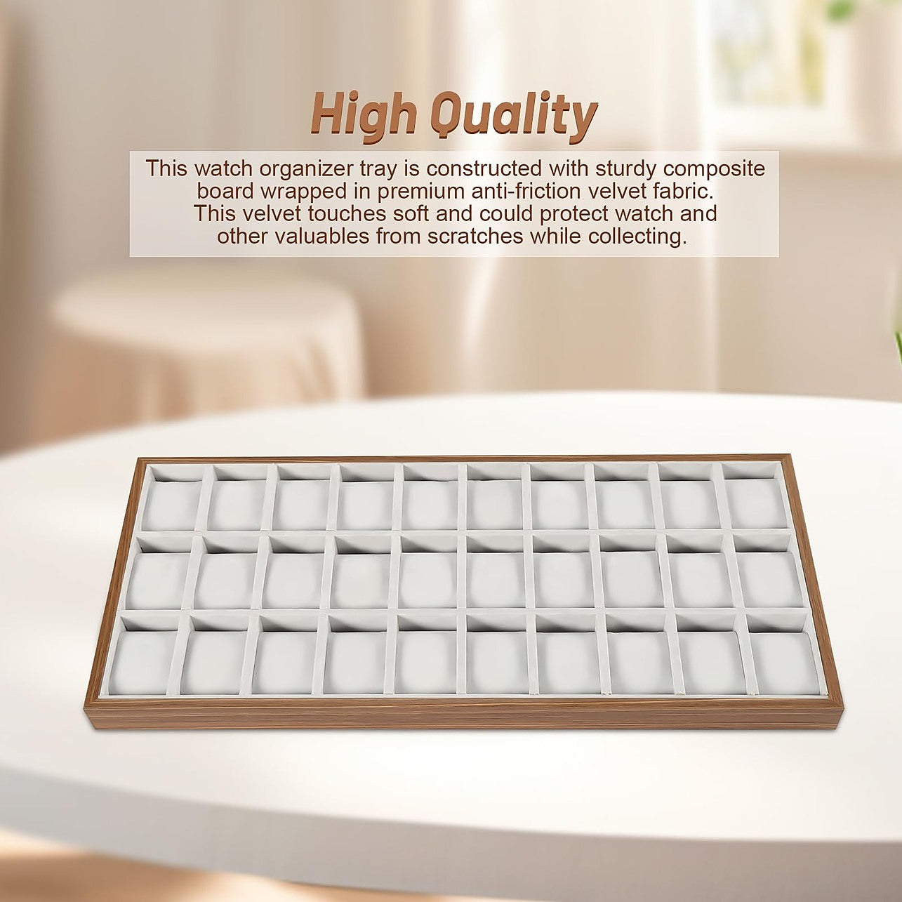 Keep your collection of watches and jewellery beautifully organised and easy to access with this 30-Grid Display Tray Organiser. Designed for both men and women, this stylish and durable display case is made from quality composite board with a smooth, rustic finish that adds a touch of elegance to any space. The anti-friction velvet fabric is soft to protect your valuables from scratches.