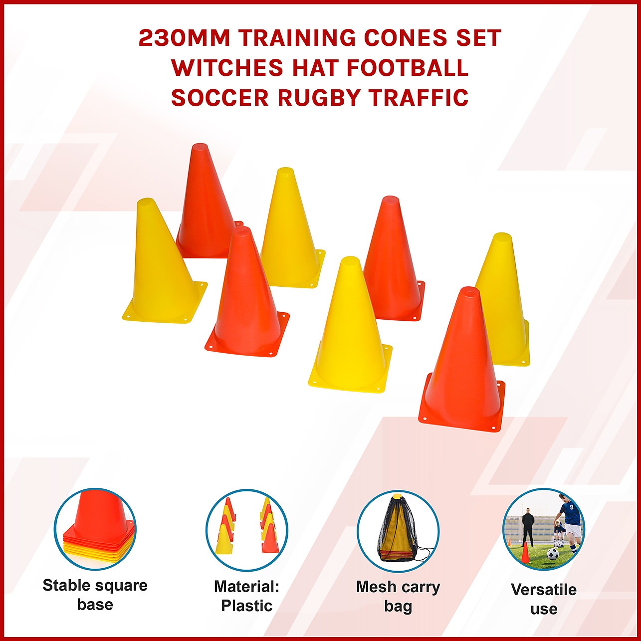 Training for rugby or football is a breeze with these 230-millimetre training cones from Randy & Travis Machinery. This eight-cone set allows you to run patterns, practice footwork, or weave in and out of the cones to hone your agility.