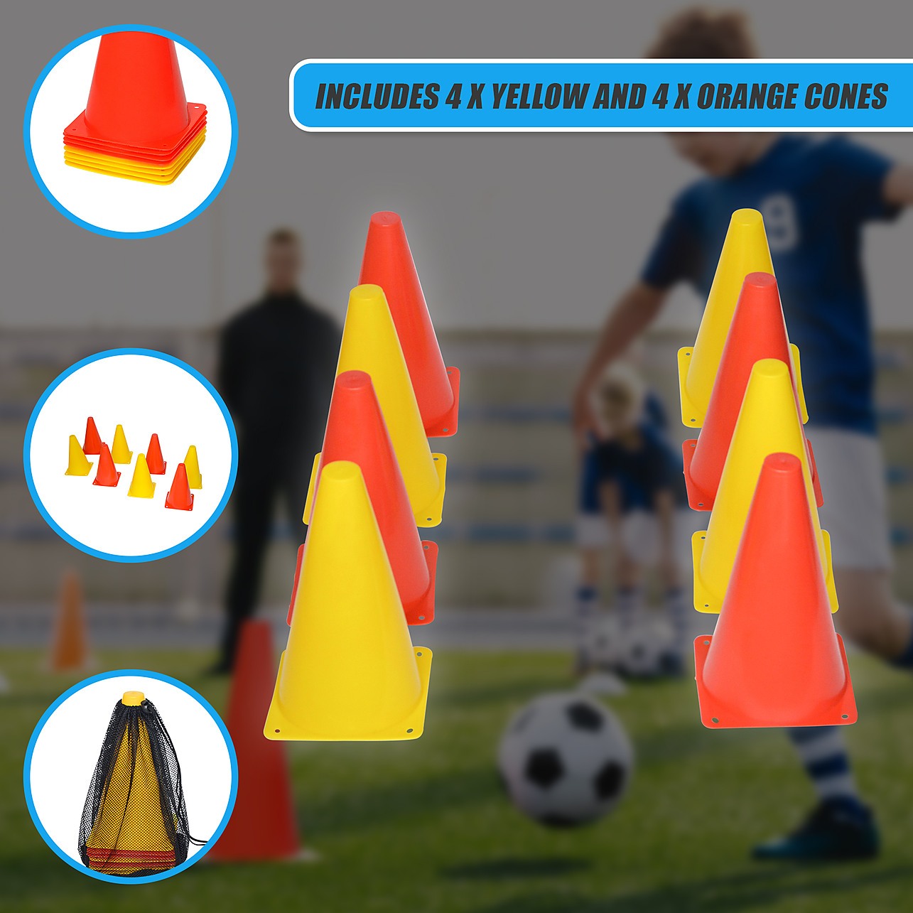 Package includes 4 x Yellow and 4 x Orange cones.