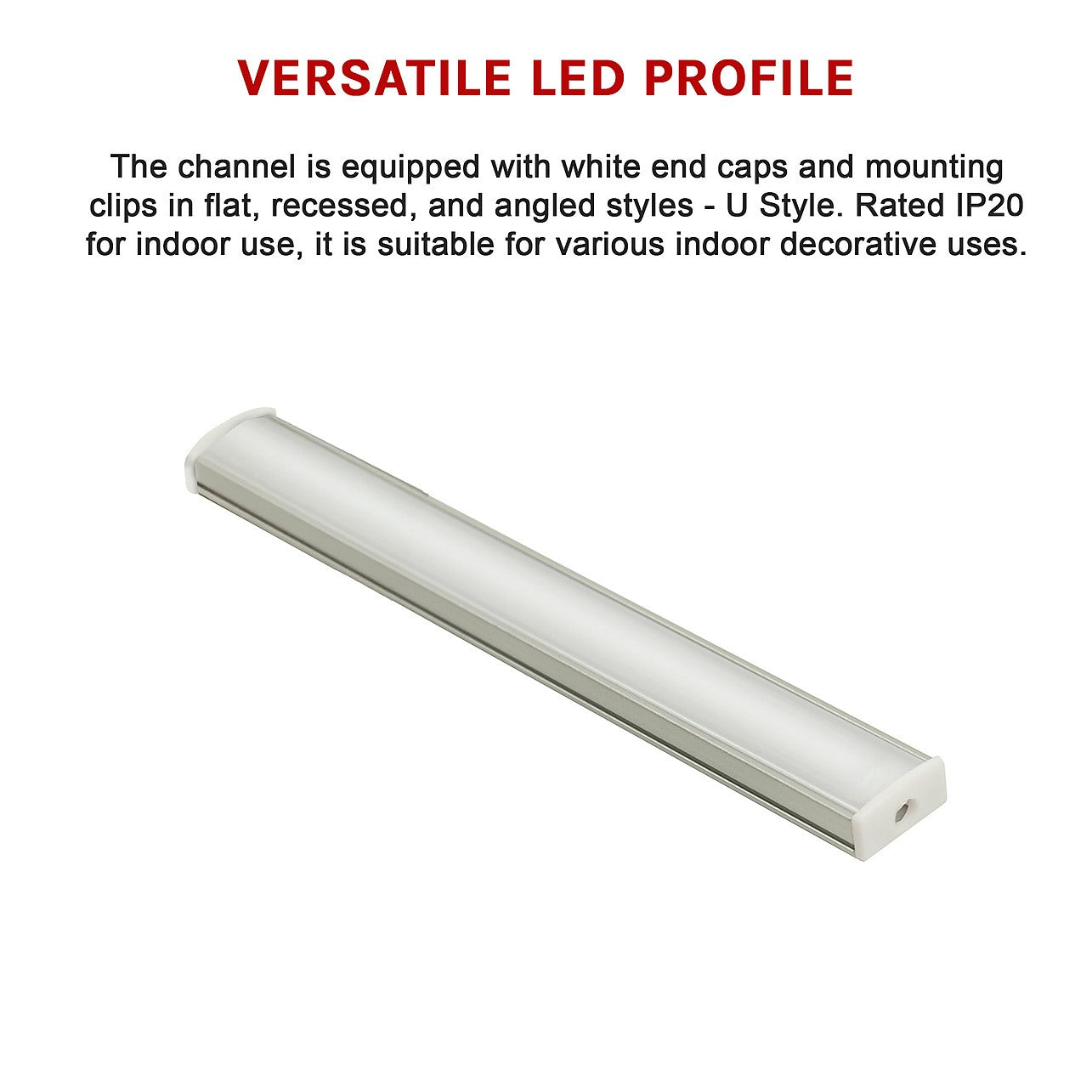 The channel is equipped with white end caps and mounting clips in flat, recessed, and angled styles - U Style. Rated IP20 for indoor use, it is suitable for various indoor decorative uses, including: