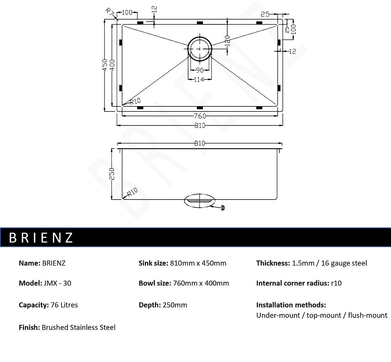 This single bowl sink is made from hand-made 1.5mm-thick Type 304 stainless steel for a brilliant look that will last and last. It measures 810 x 450 x 250mm (L x W x D) with a 90mm drain opening and an above-average depth for added versatility. A strainer waste is included. Installation is either Undermount / Topmount-style.