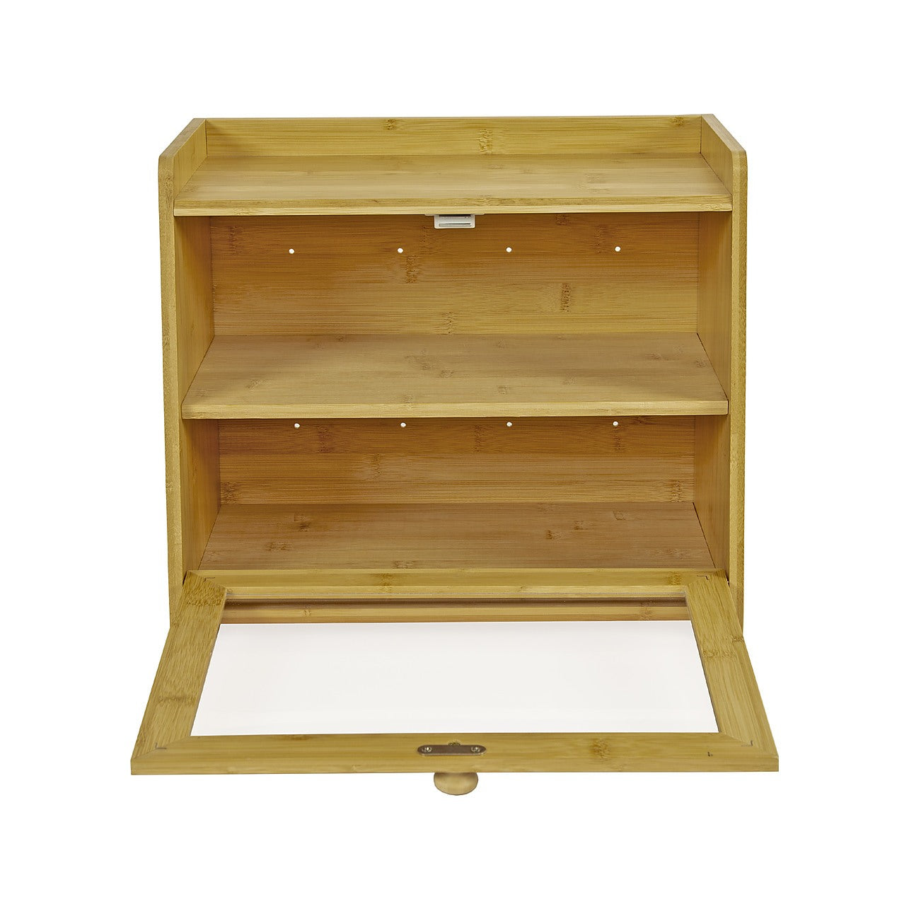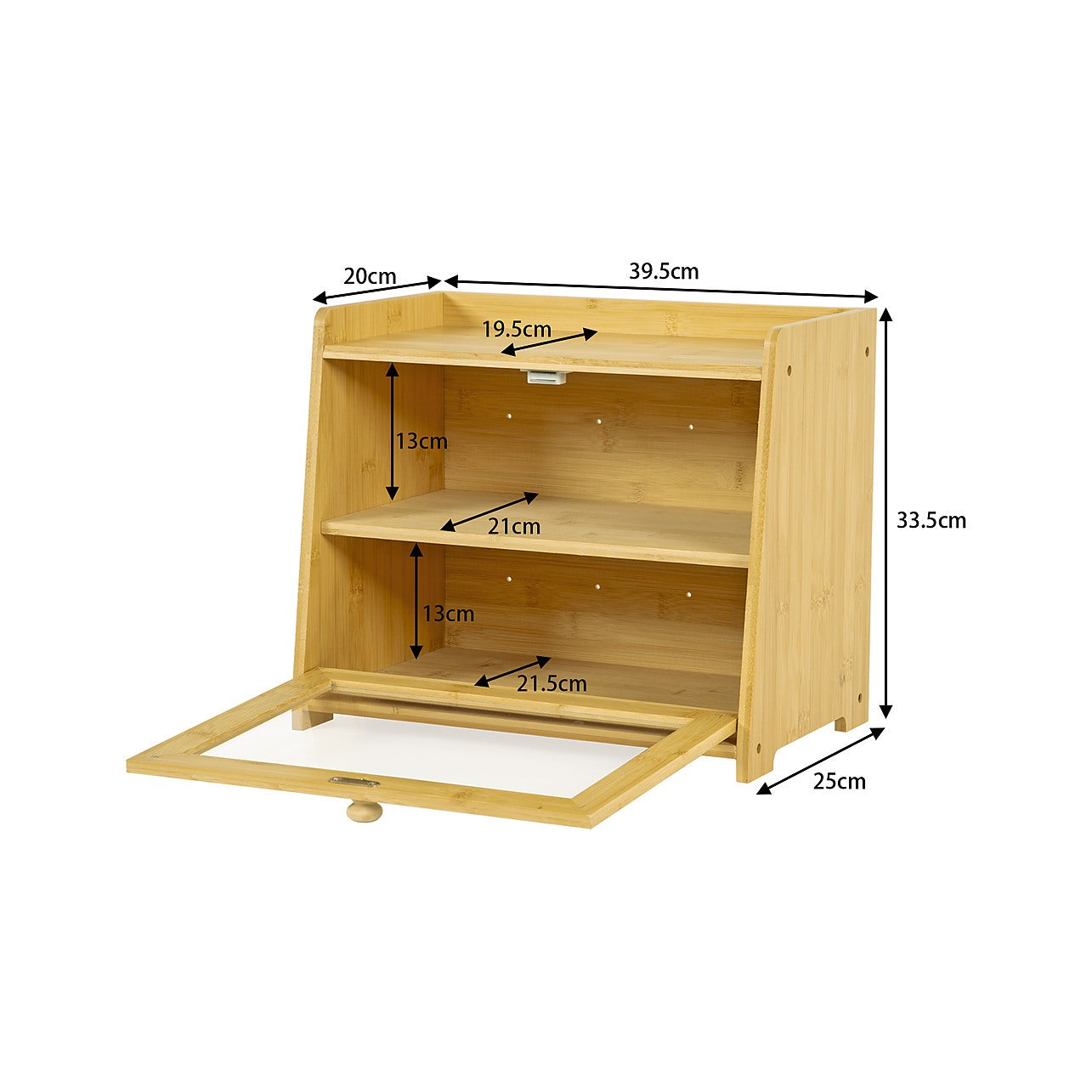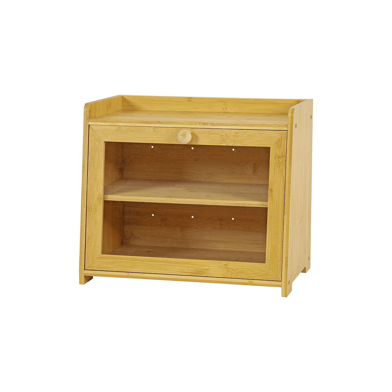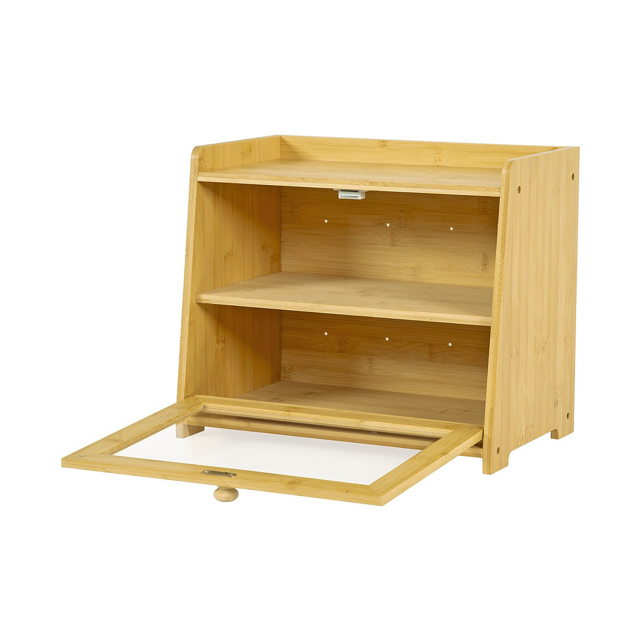 The clear acrylic door panel let you see inside without opening. It also features a wood handle with magnetic latch that keeps the door securely shut. The raised lid design of the top shelf prevents items from falling, aside from being an additional storage space. Aside from bread—fruits, coffee, tea, and other pantry supplies or condiments maybe stored as well.
