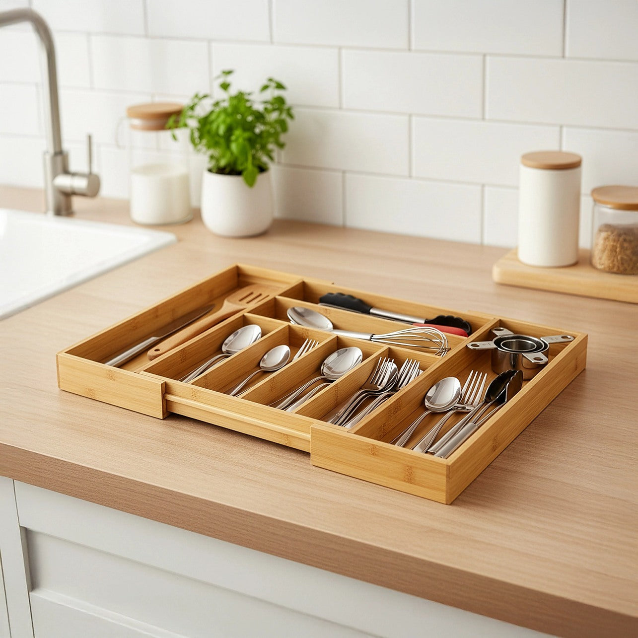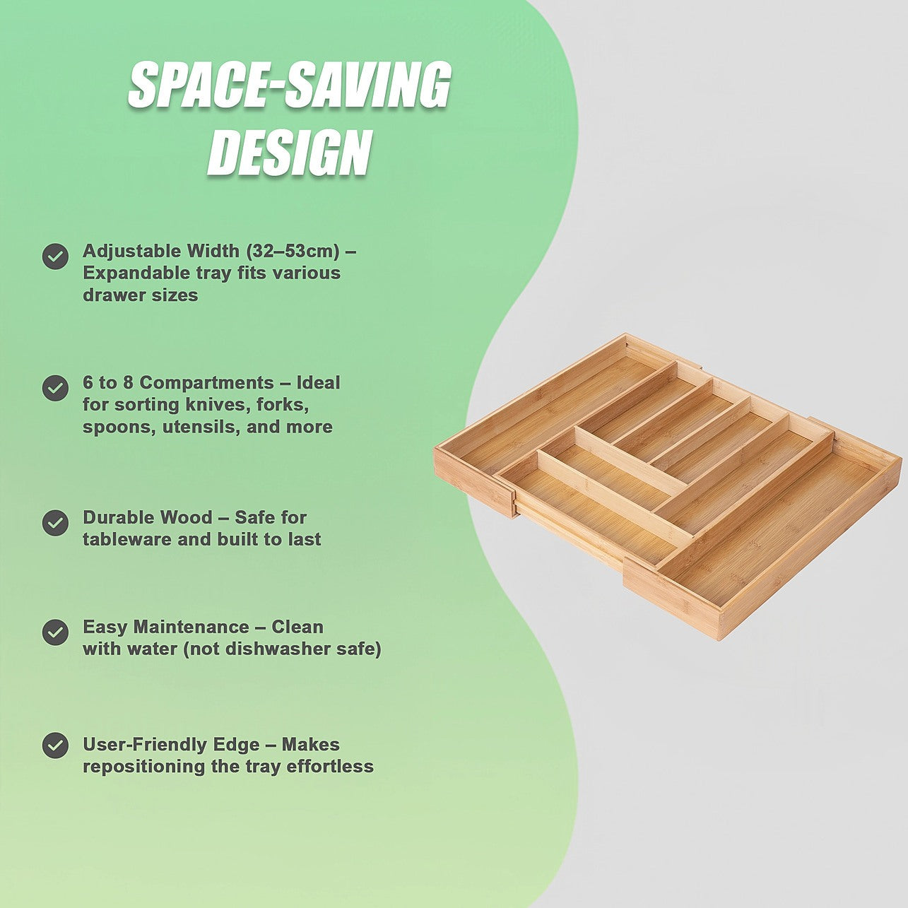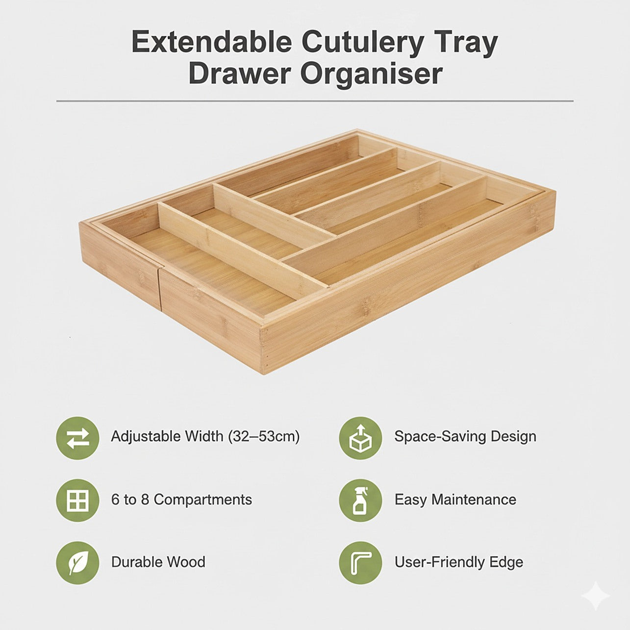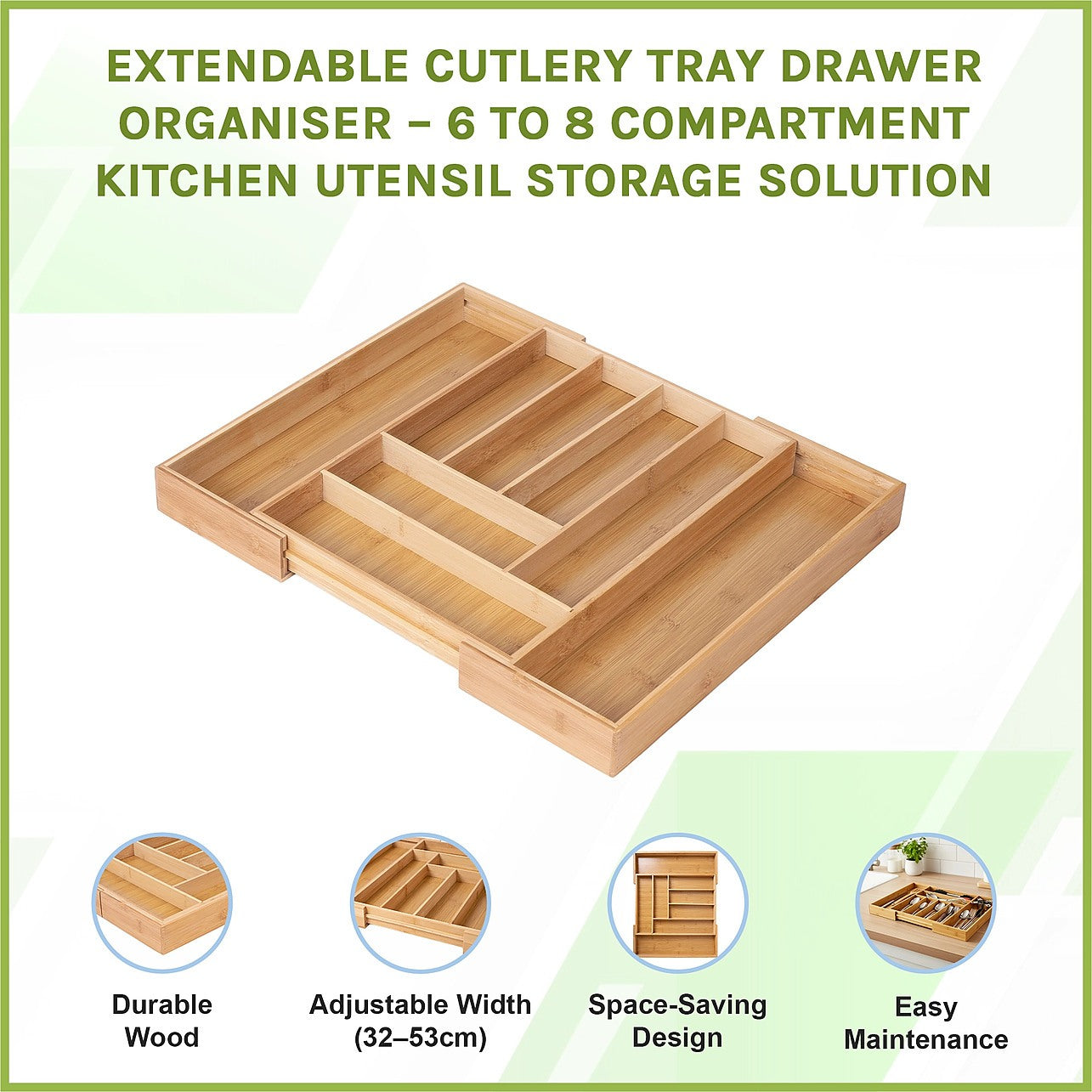 Extendable Cutlery Tray Drawer Organiser – 6 to 8 Compartment Kitchen Utensil Storage
