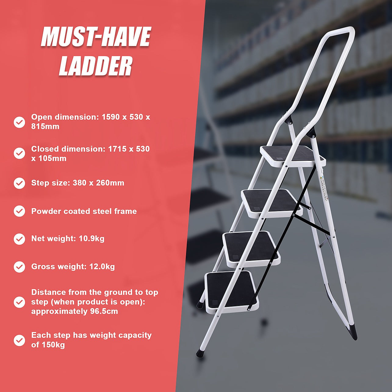 - Distance from the ground to top step (when product is open): approximately 96.5cm
