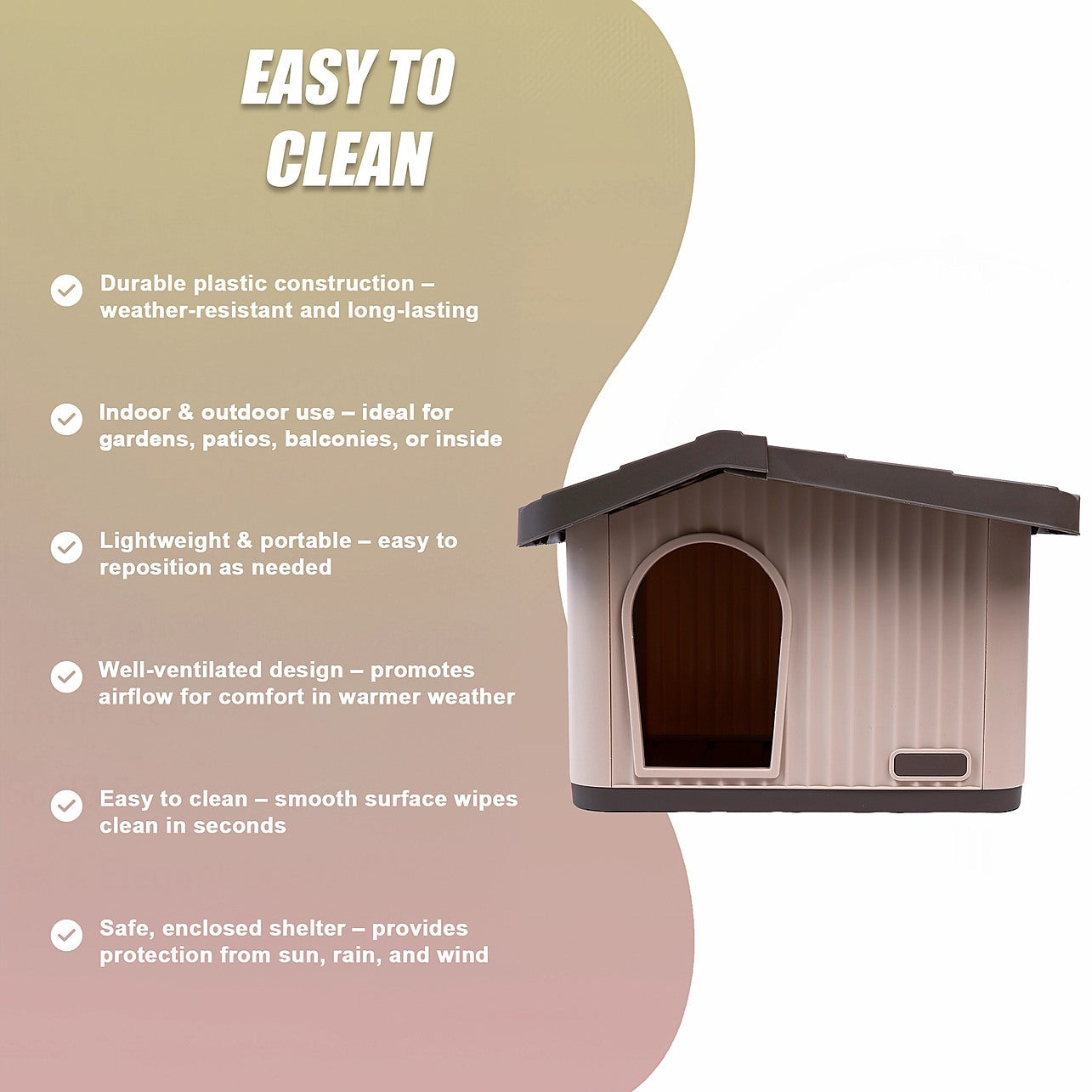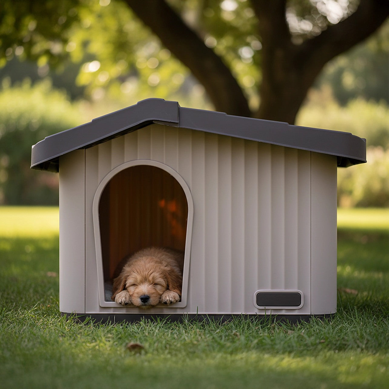 Stylish, practical, and comfortable, this plastic dog kennel offers your pet a secure place to rest while enhancing your outdoor or indoor space. A perfect everyday shelter for dogs who deserve comfort with a touch of charm.