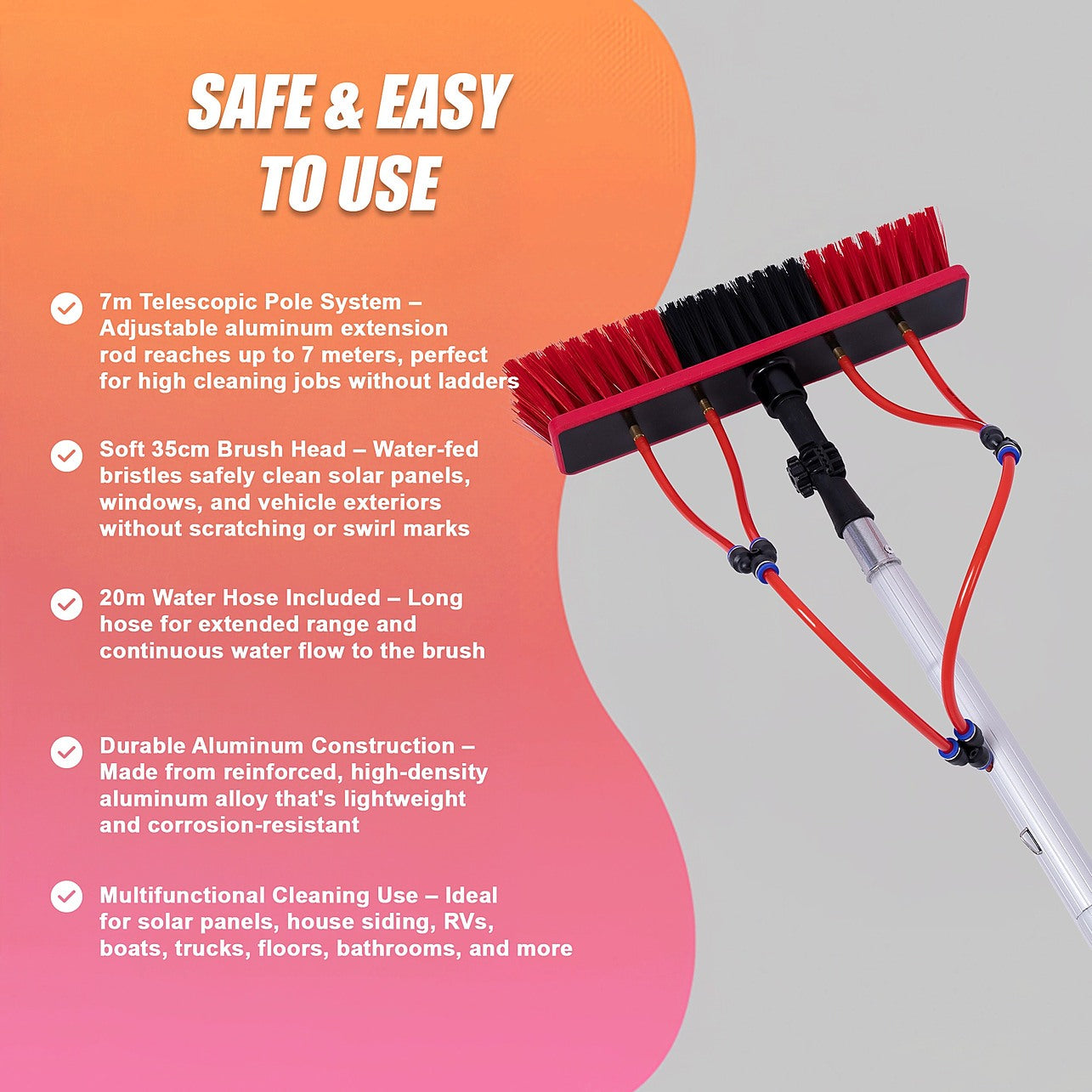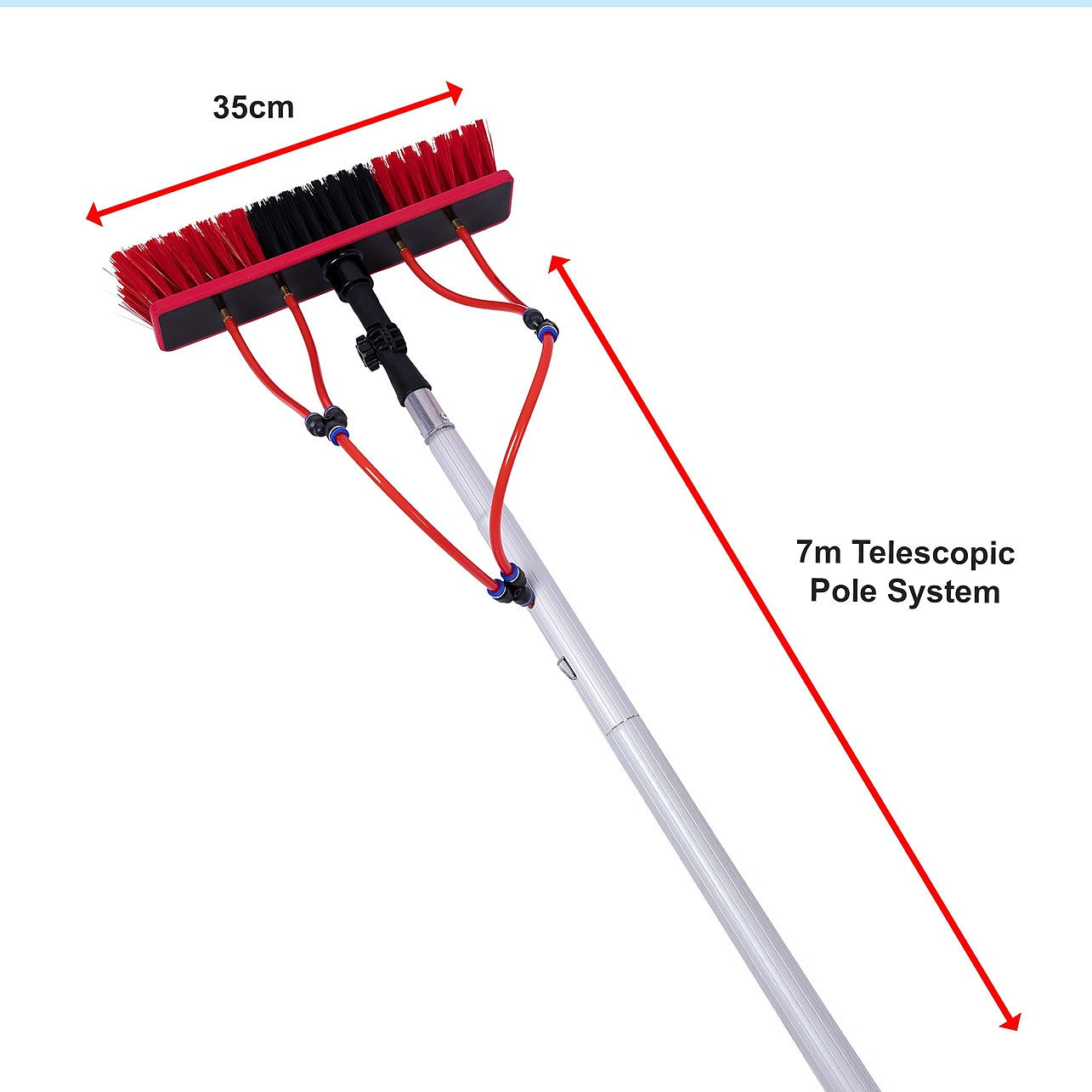 - 7m Telescopic Pole System – Adjustable aluminum extension rod reaches up to 7 meters, perfect for high cleaning jobs without ladders