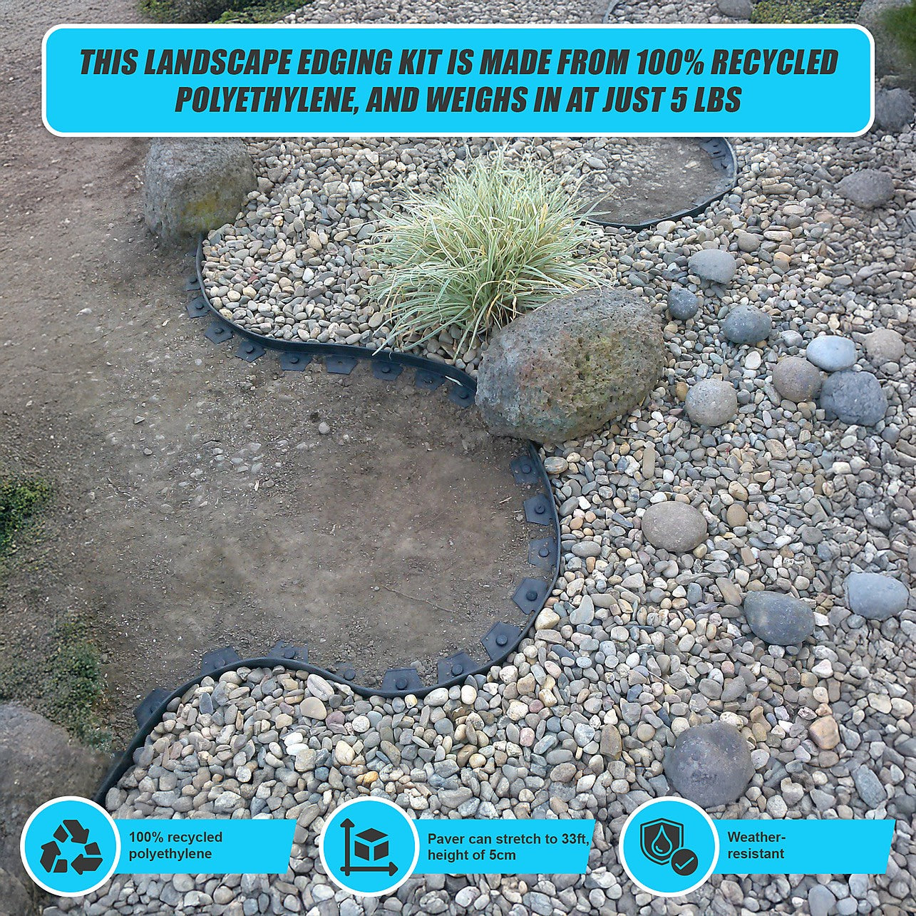 This landscape edging kit is made from 100% recycled polyethylene, and weighs in at just 5 lbs so is easy to transport for any gardening or landscaping professionals that need to take it from job to job. The paver can stretch to 33ft, and has a height of 5cm. The kit includes 30 anchoring spikes.