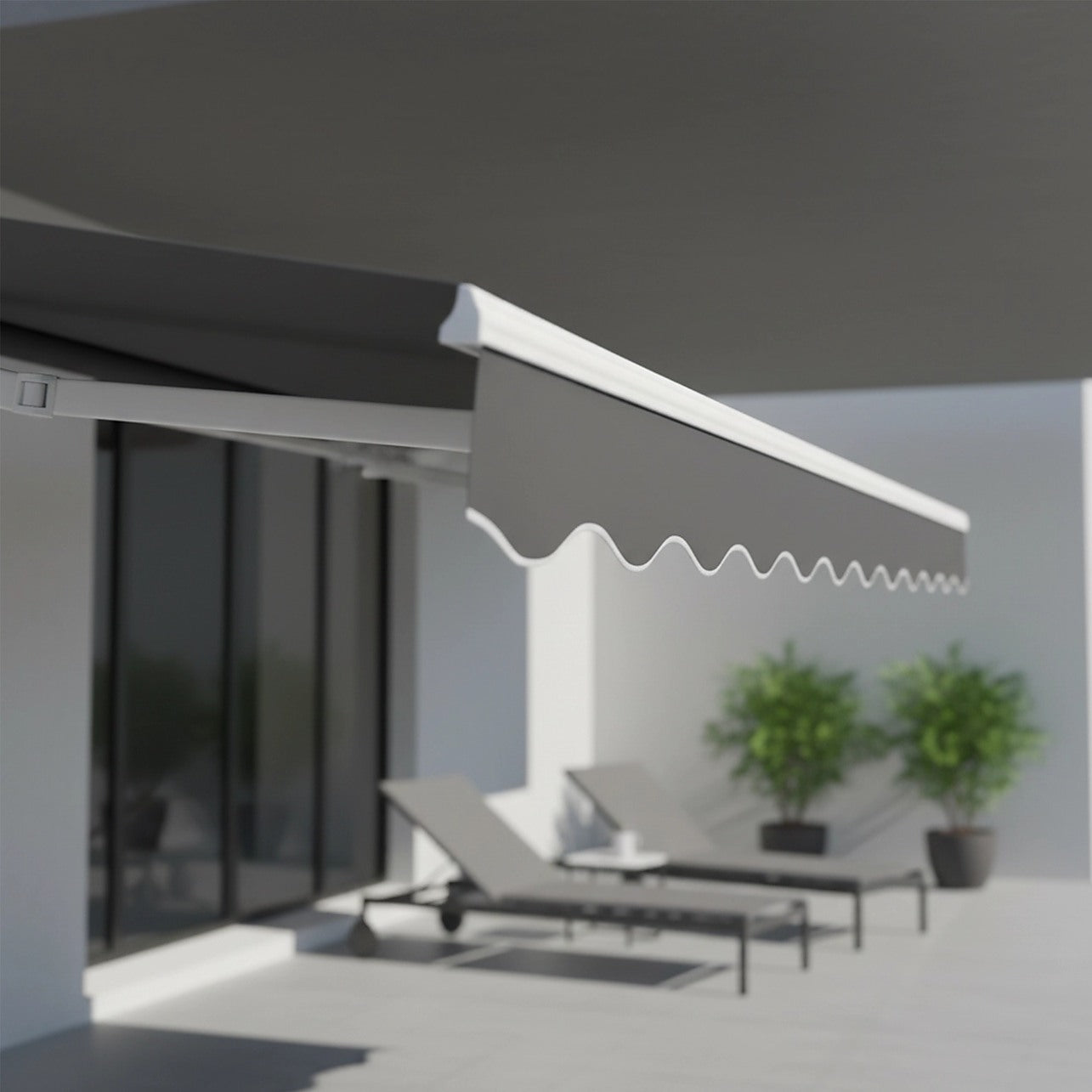Designed to last, this awning features a rugged aluminium frame, powder-coated for extra protection. UV-resistant, rust-resistant, fade-resistant and water-resistant, this awning will serve you well for years to come. The shade itself is made from 300-gsm high-quality 100 per cent polyester that stands up to whatever Mother Nature throws at it, while its neutral grey profile adds kerb appeal to your home. The scalloped trim adds visual interest and texture.