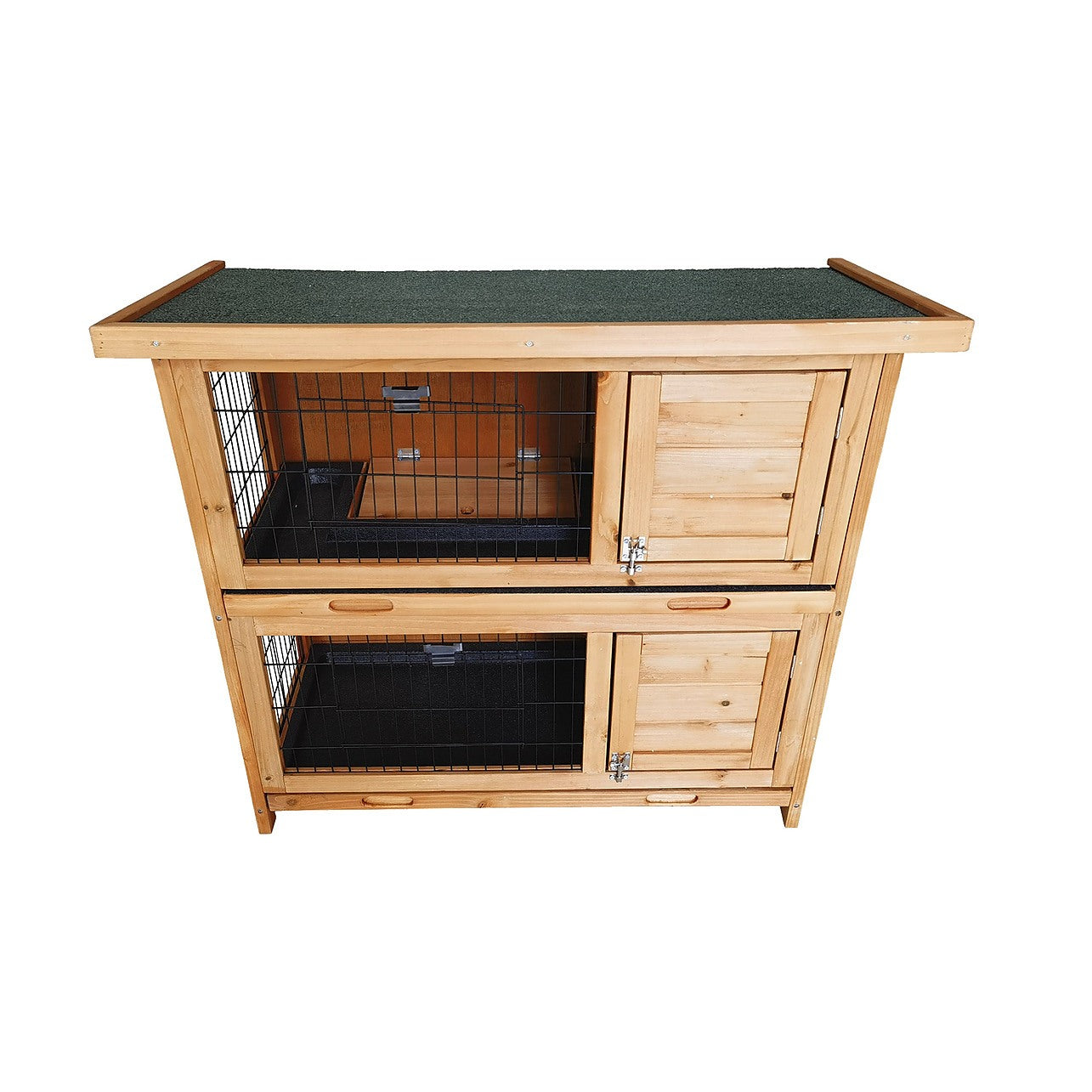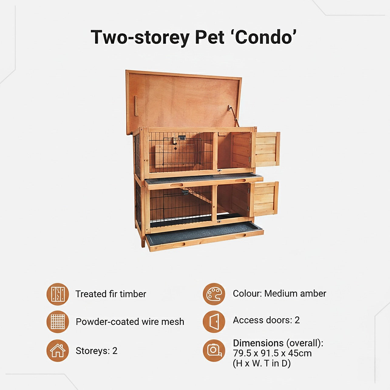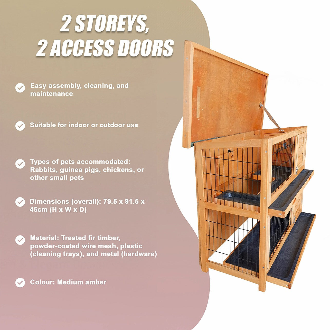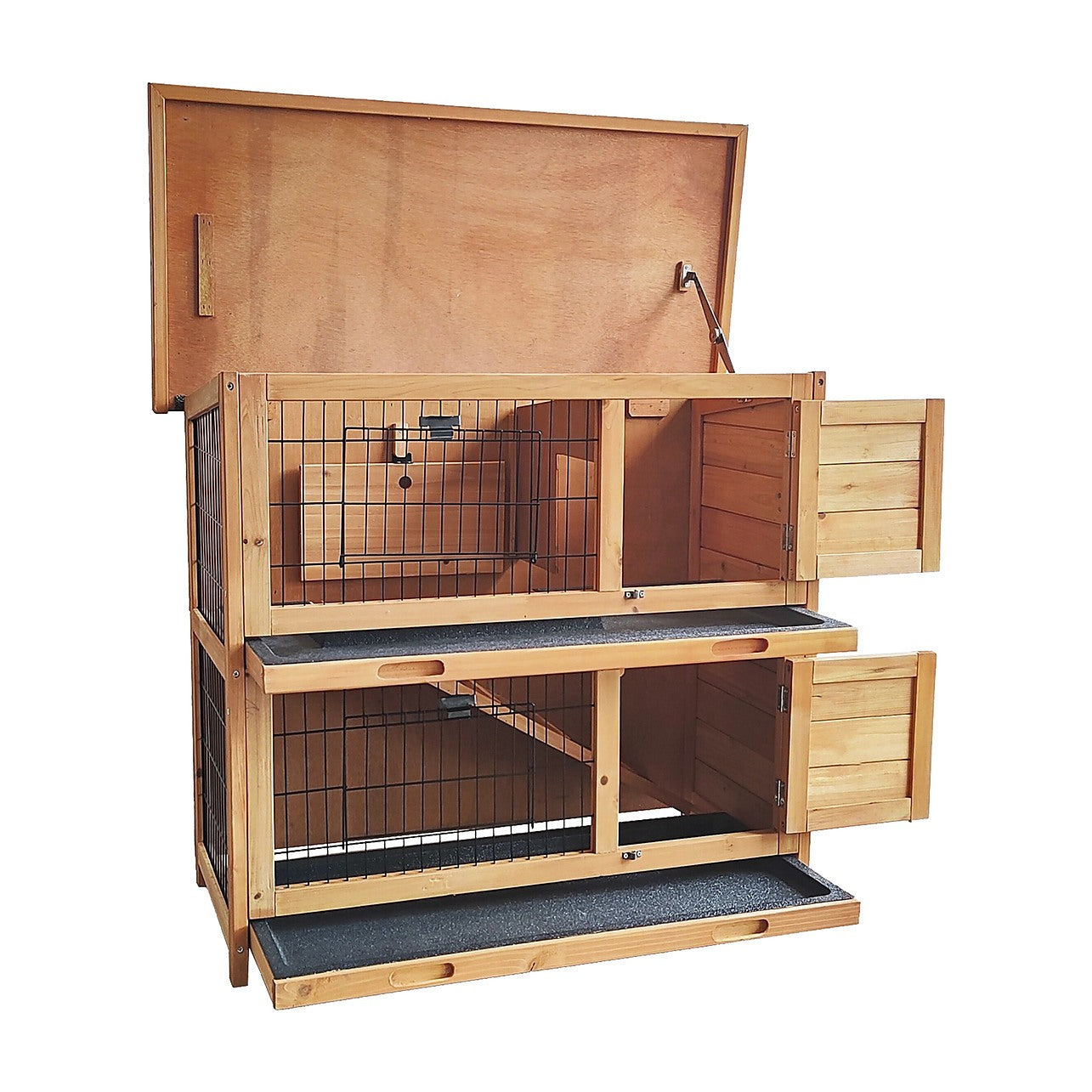 Crafted from solid fir with an amber stain, this hutch will look amazing in your backyard or garden. Its rustic finish shows off the grain of the wood, while its durable construction and powder-coated wire mesh will protect your pets for years to come. It's waterproof and easy to assemble – and you can even use it to shelter two animals simply by separating each level. Pull-out trays and an easy-open roof make cleaning a breeze. Your pets deserve a home as lovely as your own. Get your two-storey hutch today!