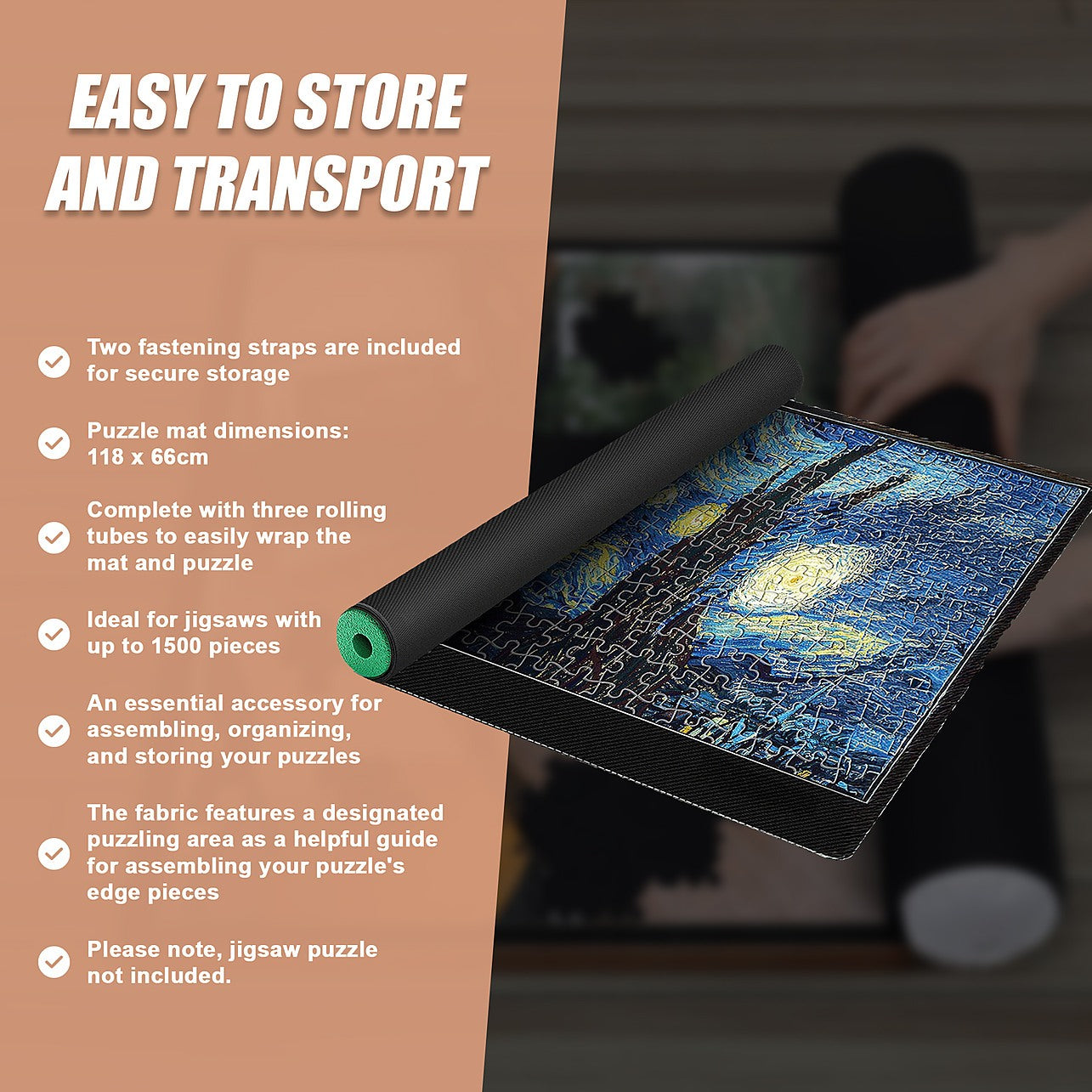 Assemble your puzzle directly on the high-quality non-slip felt surface, then simply roll it around the tube when it's time to pause or put it away. The included straps keep everything tightly secured for safe storage or travel. This portable puzzle mat supports most standard puzzles up to 1500 pieces, making it ideal for casual puzzlers and enthusiasts alike.