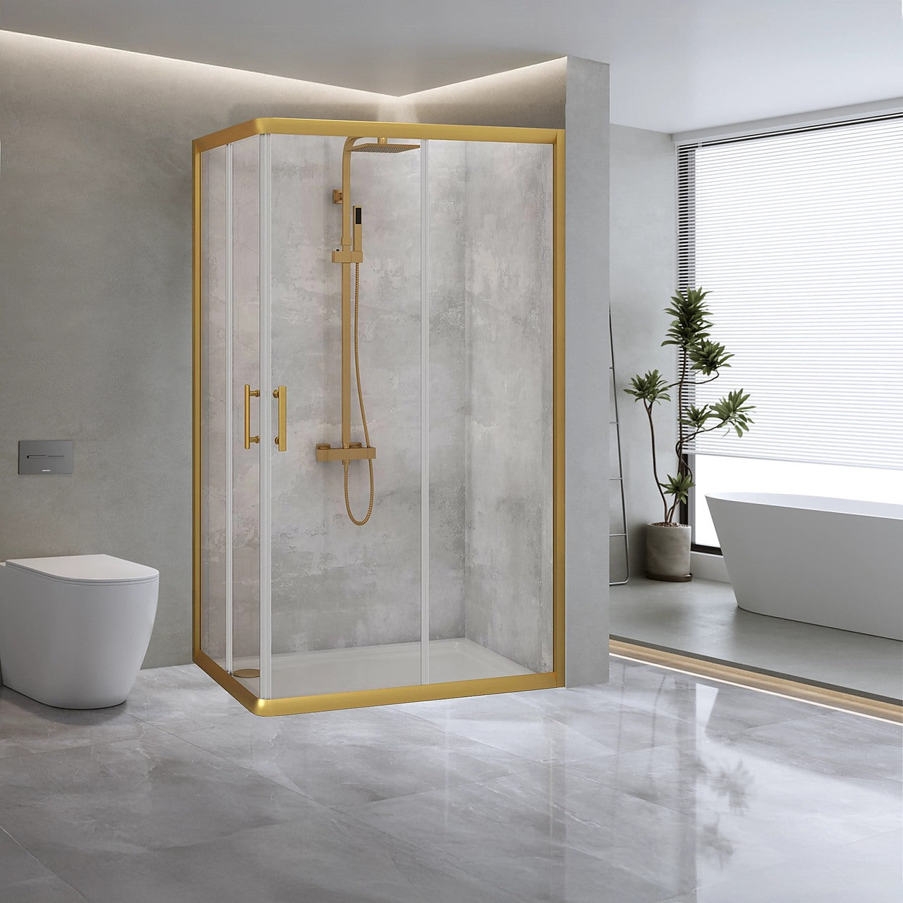 Experience effortless usability, facilitated by the state-of-the-art 16-wheel system that guarantees smooth and noiseless door operation. Additionally, maintaining its pristine condition is a breeze, thanks to the quick-release door feature. It comes with a waterproof assurance, showcasing magnetic seals and high-caliber gold hardware that's rust-resistant due to its stainless steel composition. The included side panel offers a versatile fit, accommodating both right and left-hand installations with a 100mm wall adjustment capability.