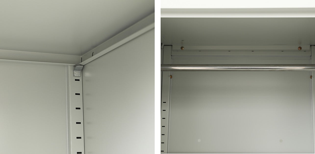 The steel material has a thickness of 0.6mm. The bottom panel is designed with side and central reinforcement, hidden metal hinges and galvanized screws. It has a concealed security lock and adjustable legs for greater stability.