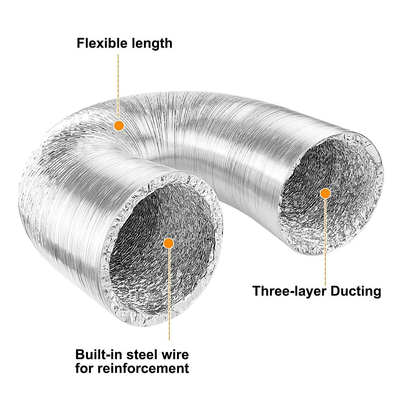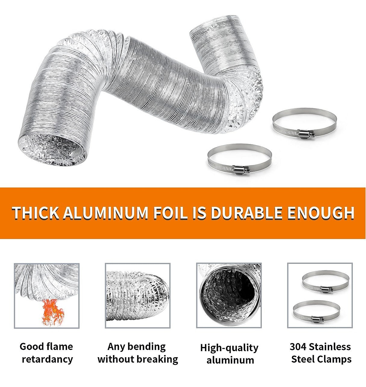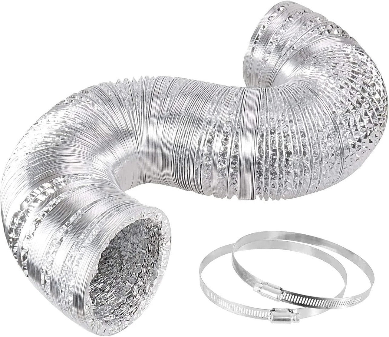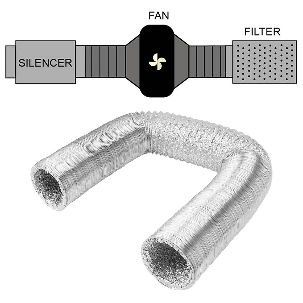 Upgrade your ventilation setup with this flexible 10.5cm x 7.6m aluminium air ducting hose. Built with triple-layer construction—aluminium foil + PET + aluminium foil—this durable and fire-resistant ducting is ideal for HVAC, dryer vents, grow tents, greenhouses, kitchens, and more. The flexible design, reinforced with a steel-wire helix, makes it easy to install in tight or hard-to-reach spaces. Includes stainless steel clamps for a secure fit and leak-proof performance.