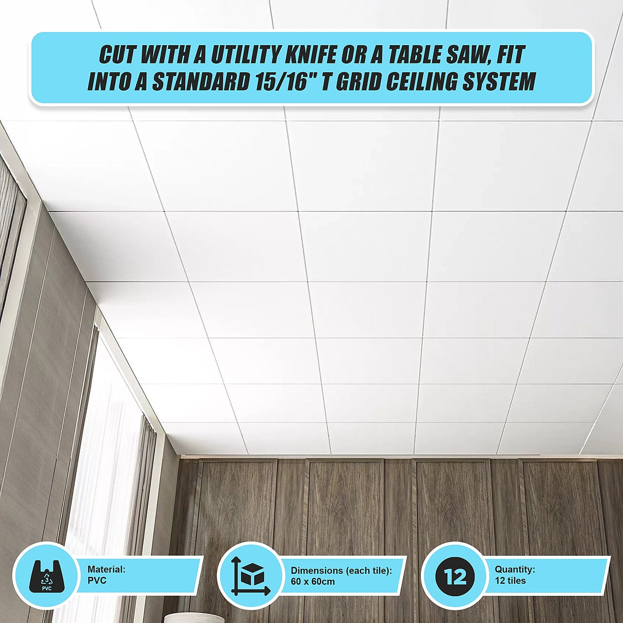 12pc 60x60cm Smooth PVC Drop Ceiling Tiles – Durable Panels for Office & Home