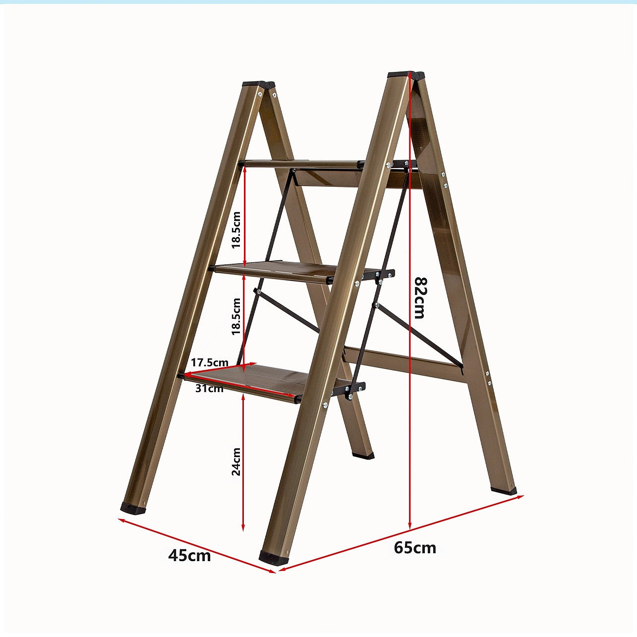Crafted from high-quality aluminium with a stable triangular frame, this foldable step ladder supports up to 150kg while remaining lightweight and easy to carry. The wide, textured anti-slip pedals and rubber feet ensure secure footing, while its slim foldable design makes storage effortless in cupboards, garages, or behind doors.