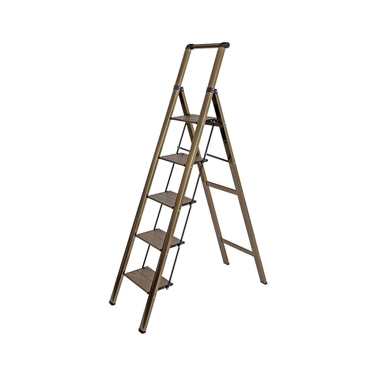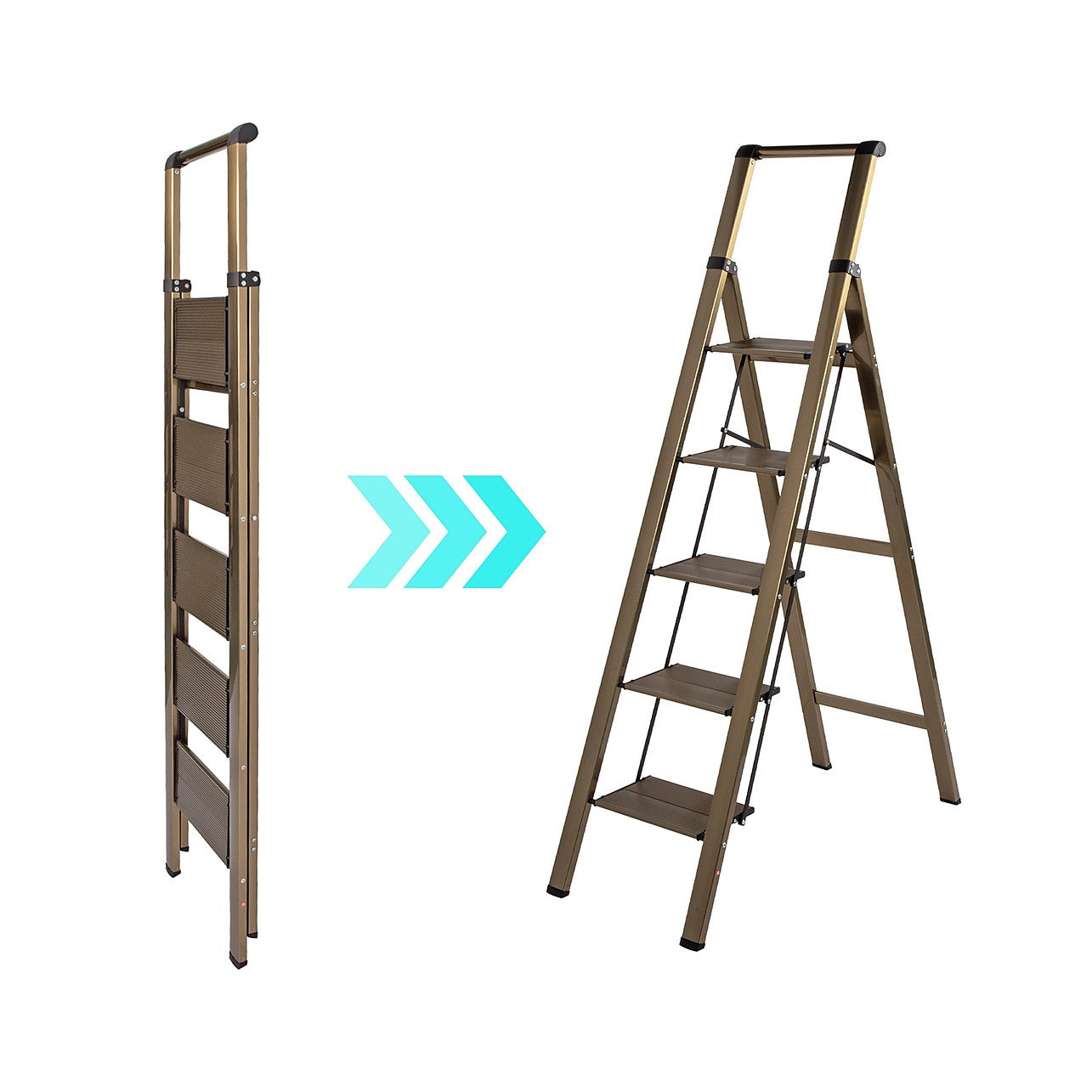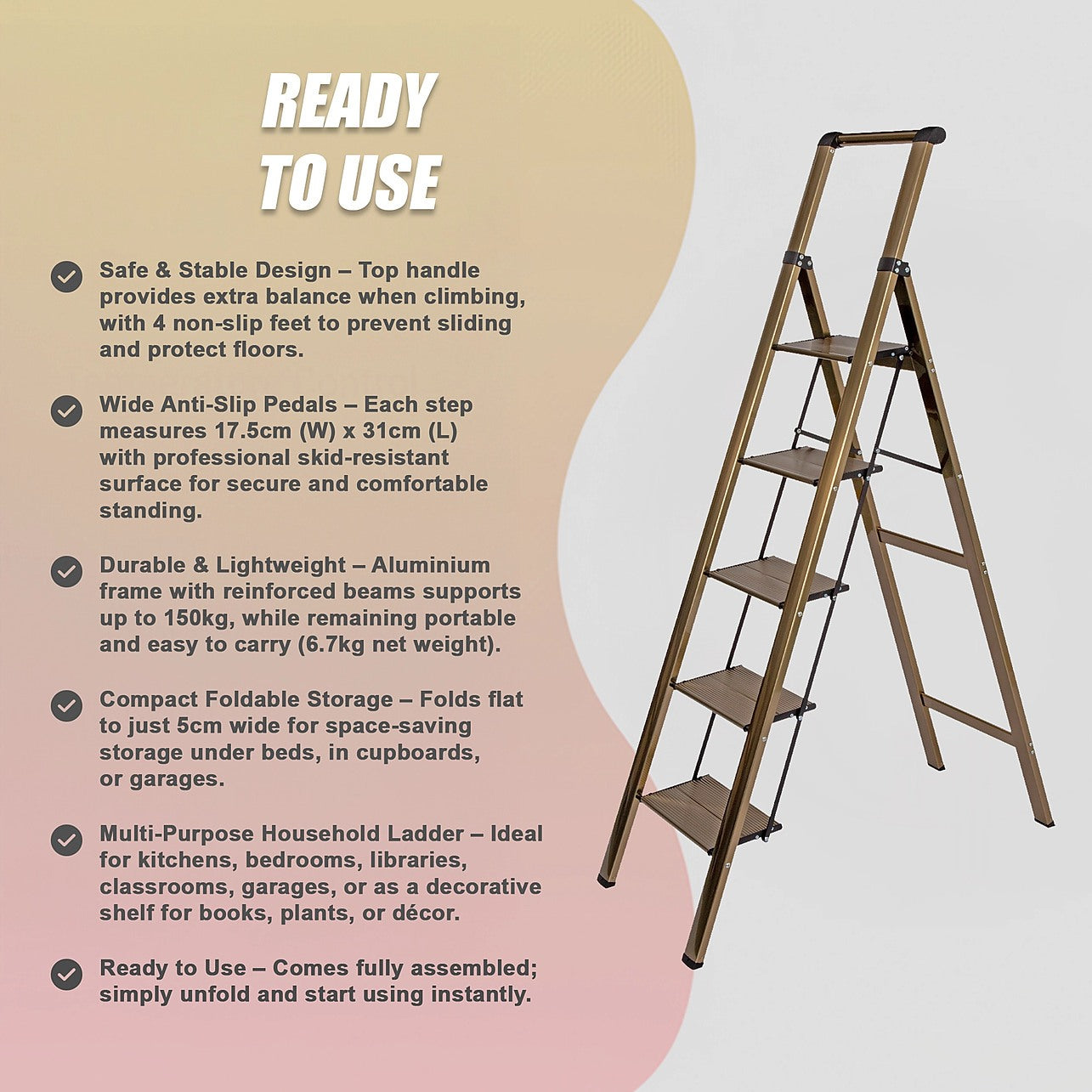 With a compact foldable design, you can store it easily in cupboards, garages, or under furniture when not in use. Fully assembled and ready to use, this 5 step folding ladder is perfect for kitchens, bedrooms, libraries, classrooms, garages, or even as a decorative ladder for books and plants.