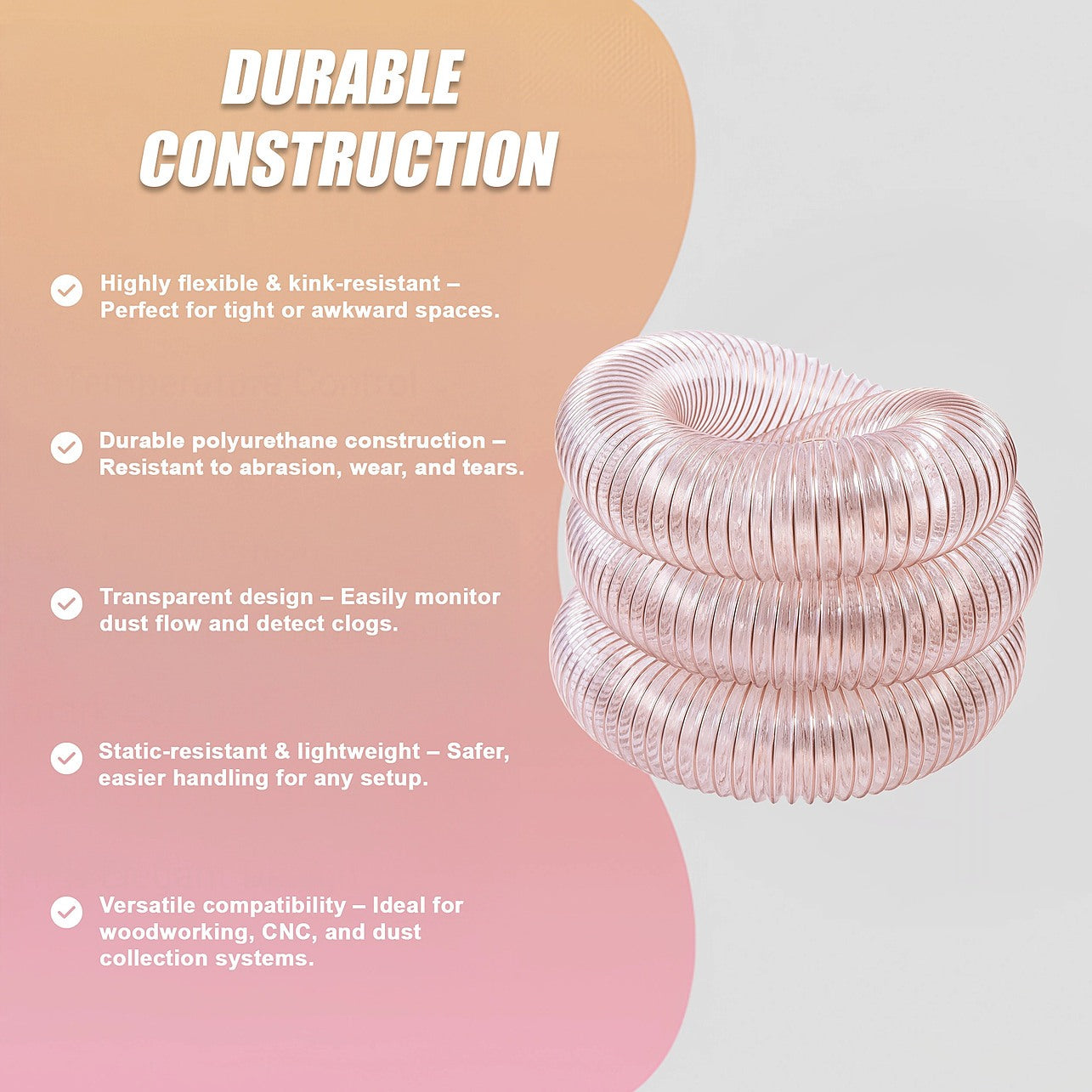 Its transparent design lets you easily monitor airflow and detect blockages, while the anti-static, kink-resistant construction ensures smooth operation in tight spaces. Lightweight yet durable, this hose is ideal for connecting to dust extractors, vacuums, and workshop machines for a cleaner, safer workspace.