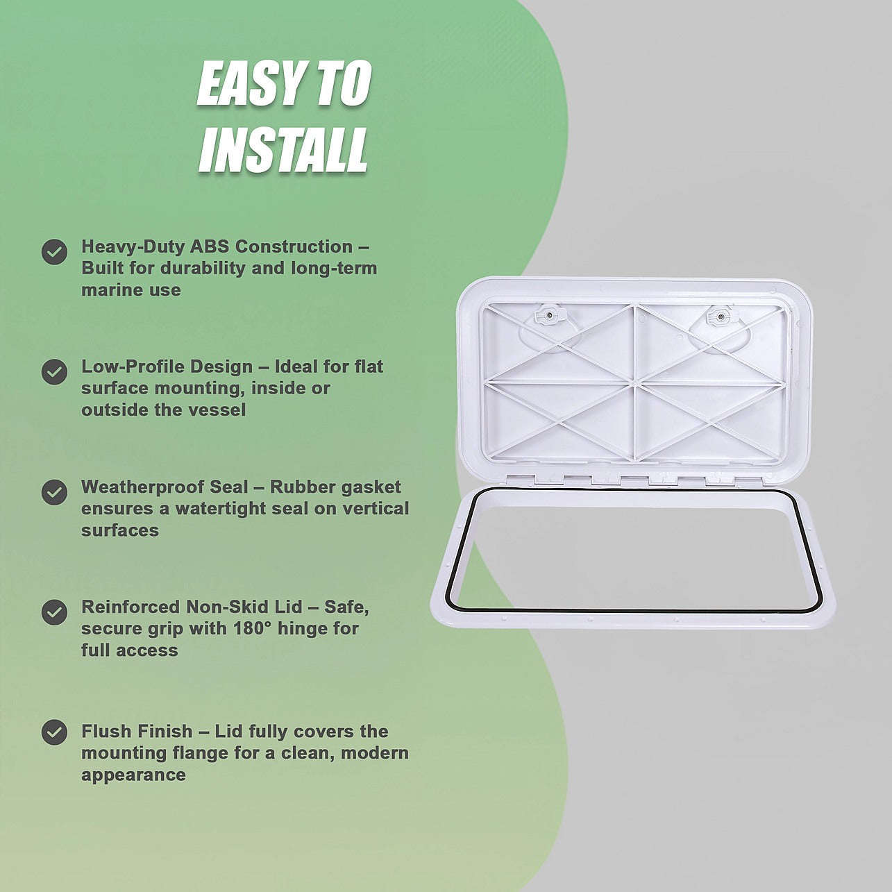 Upgrade your marine or RV storage with this White Marine Boat Deck Access Hatch*, engineered for strength, longevity, and seamless integration. Constructed from heavy-duty ABS plastic, this low-profile hatch is built to withstand harsh marine environments while providing a clean, flush-mounted finish. Suitable for both internal and external flat surfaces, the hatch features a reinforced, non-skid lid that opens 180° and completely conceals the mounting flange—delivering both function and a sleek look.