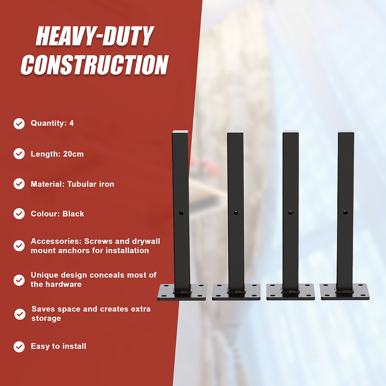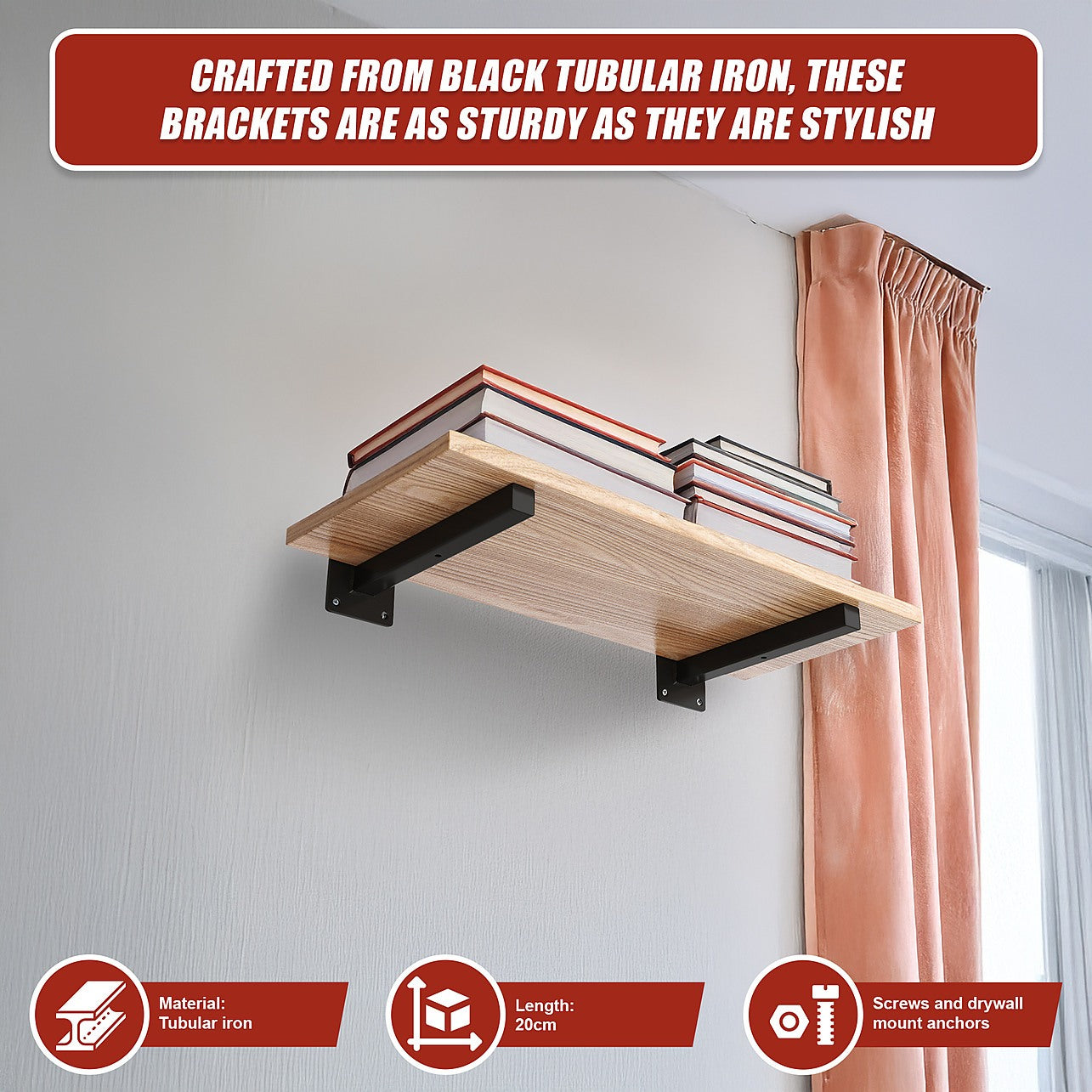 Crafted from black tubular iron, these brackets are as sturdy as they are stylish. Their neutral black colour blends into the background while their unique design hides most of the hardware. They're easy to install in mere minutes and come with all the hardware you need to get the job done.