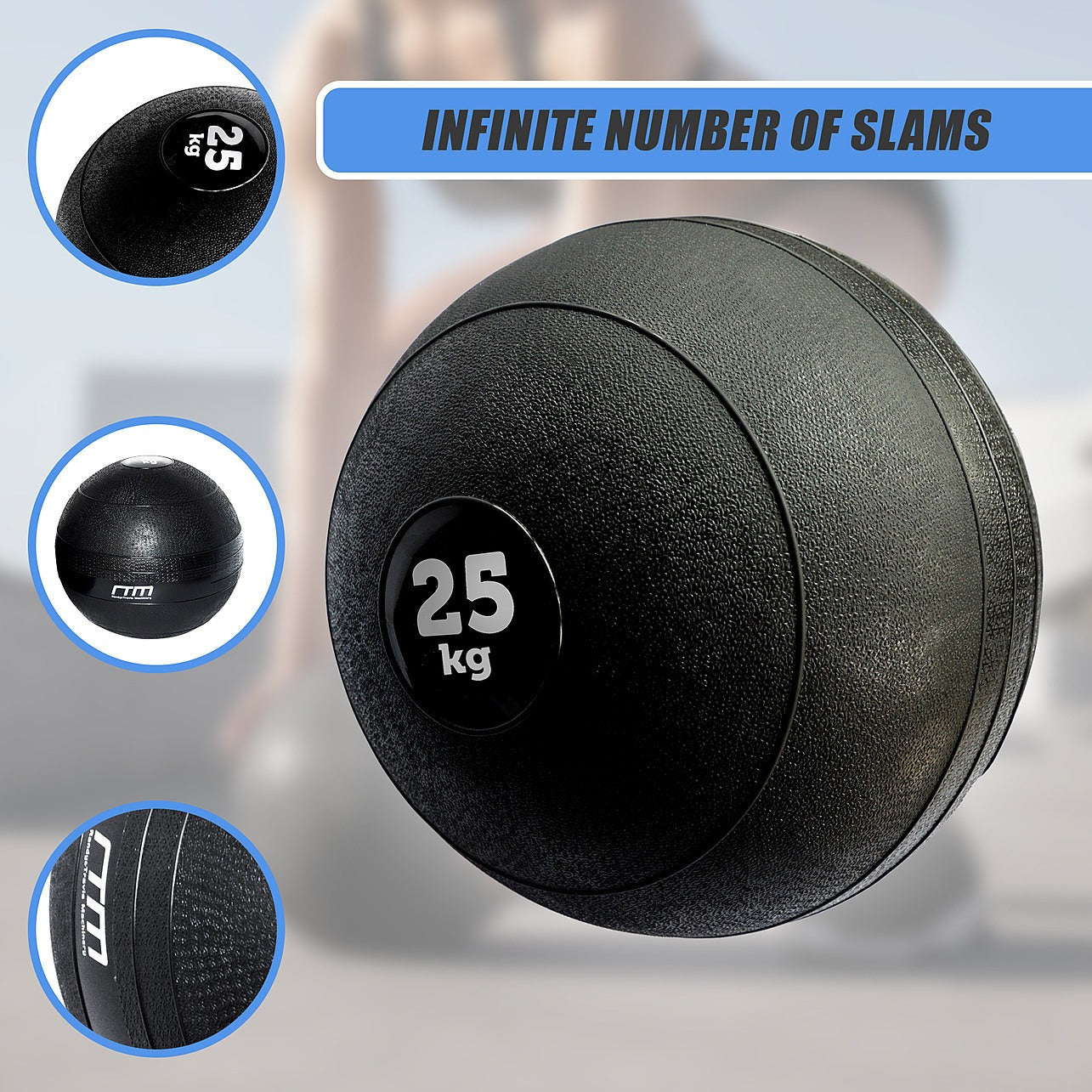 The 25kg Slam Ball offers no-bounce design and is intended for repeated slamming on solid surfaces. Great for CrossFit, MMA, boot camp, ab workout, rehabilitation, and many other exercises. The sand filled inside keeps the ball from bouncing and rolling around during use.