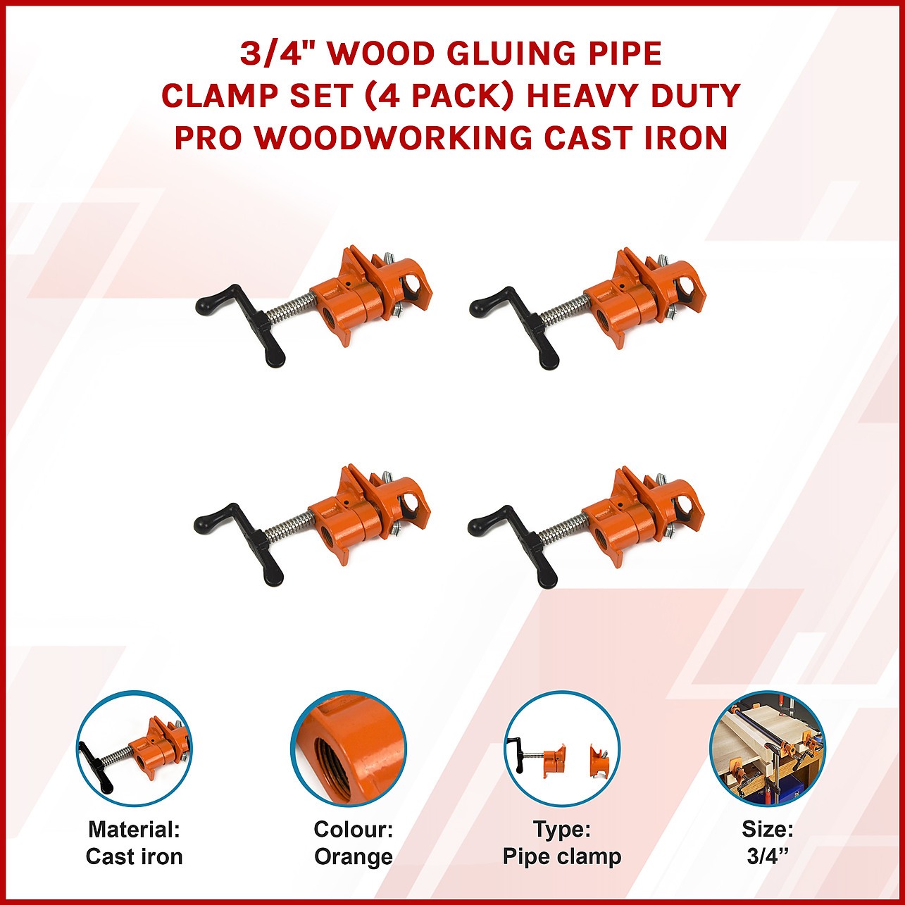 3/4" Wood Gluing Pipe Clamp Set (4 Pack) Heavy Duty PRO Woodworking Cast Iron