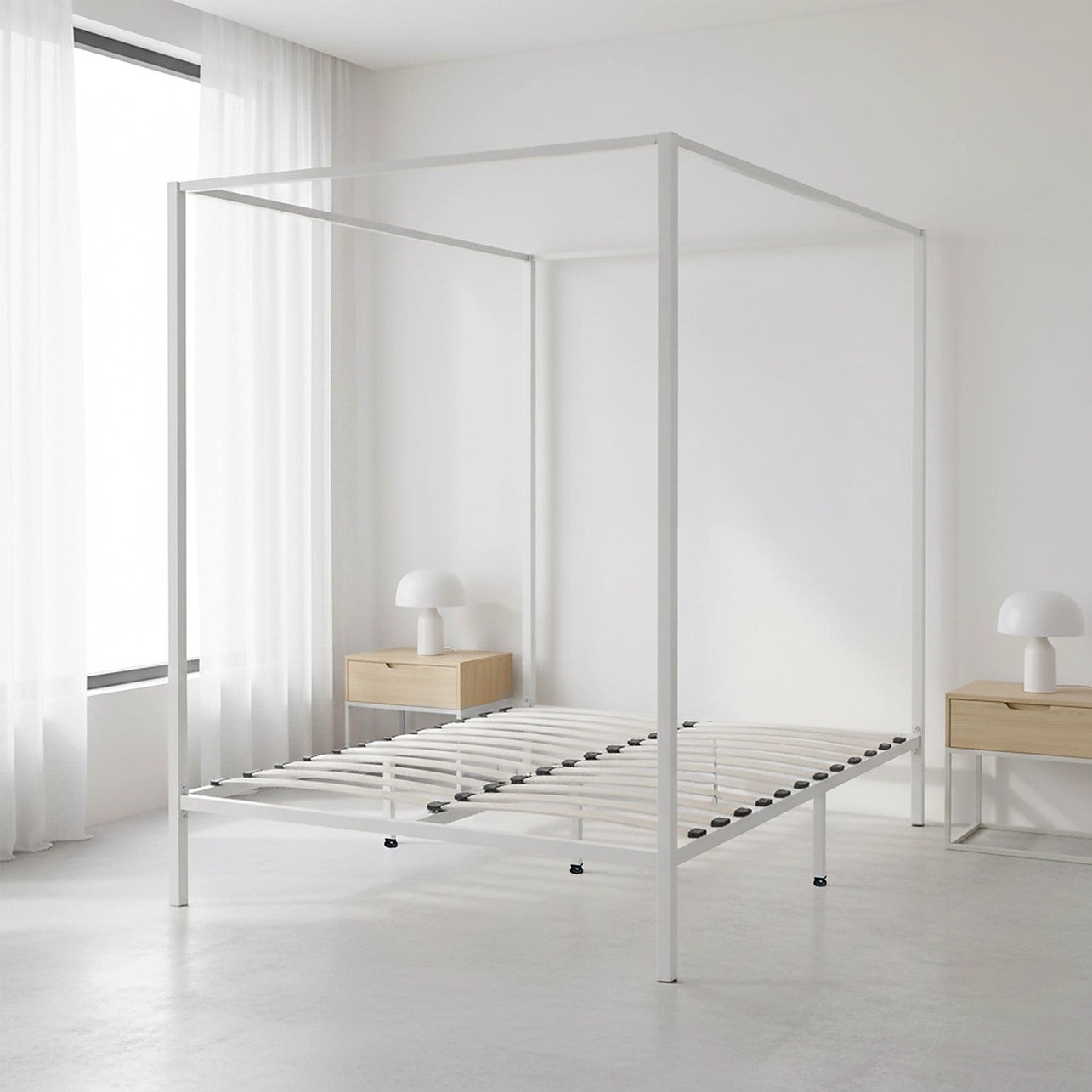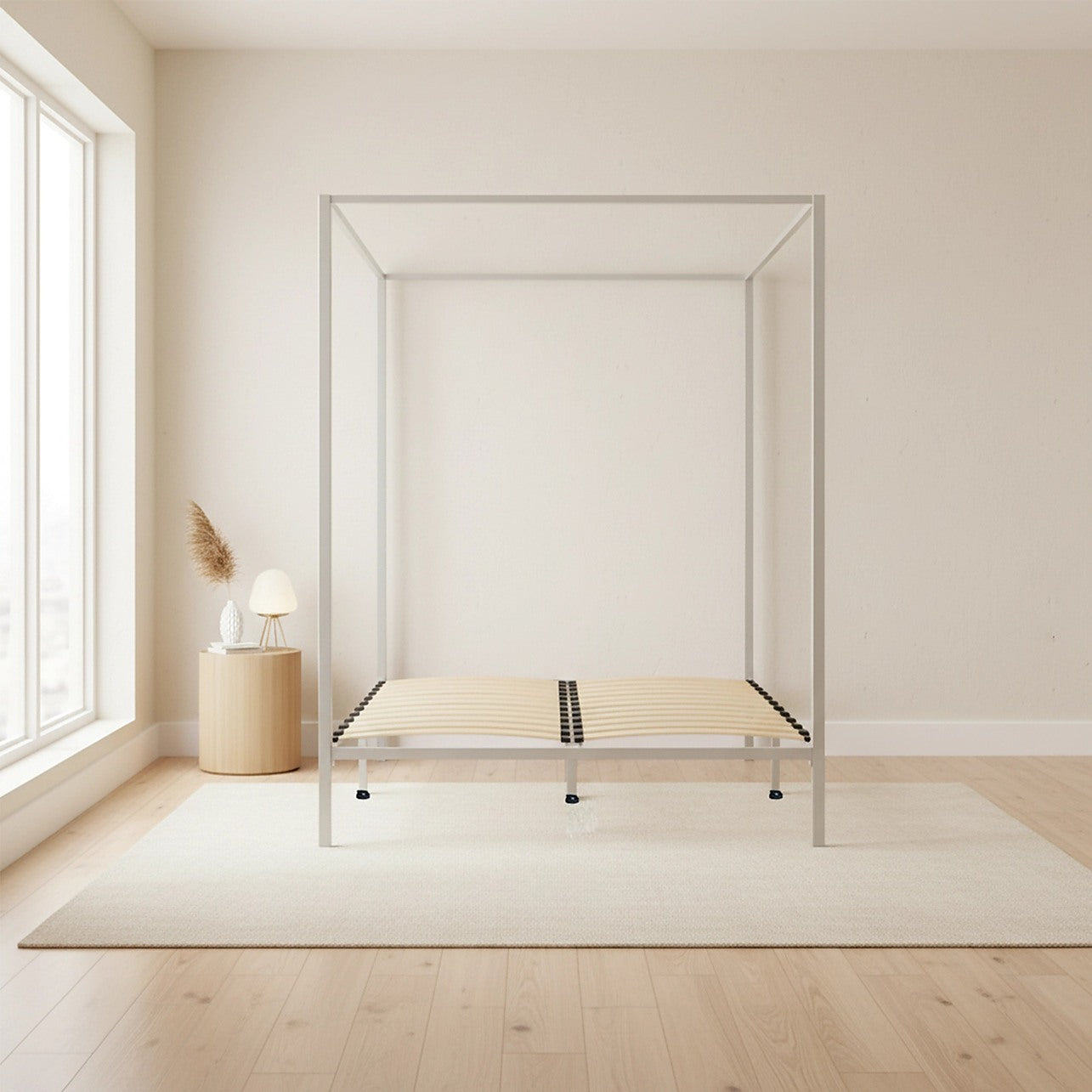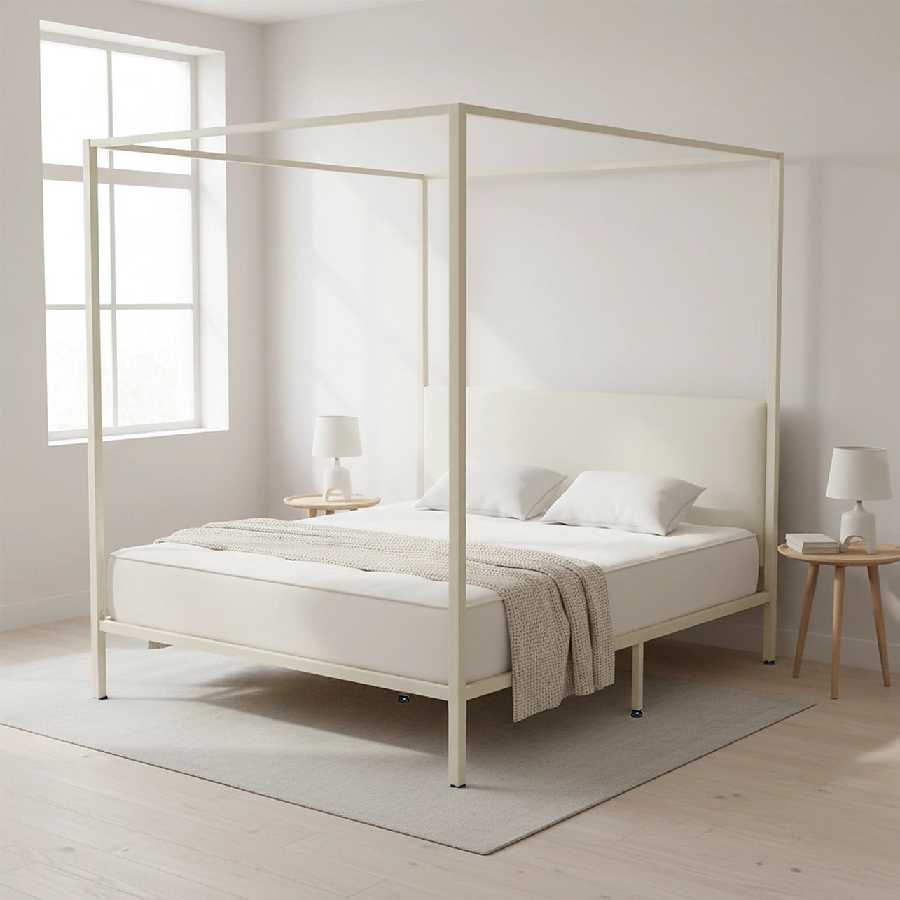4-Poster Double Bed Frame – Sturdy Cream Modern Canopy Bed for Bedroom