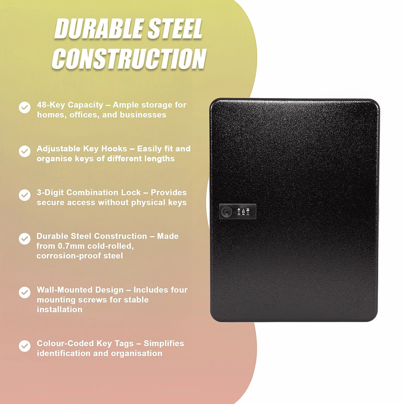 Built from high-quality cold-rolled steel, the cabinet features a 3-digit mechanical combination lock for dependable security — no more worrying about lost keys. The 48 adjustable hooks allow flexible key organisation, accommodating keys of various lengths for ultimate convenience.