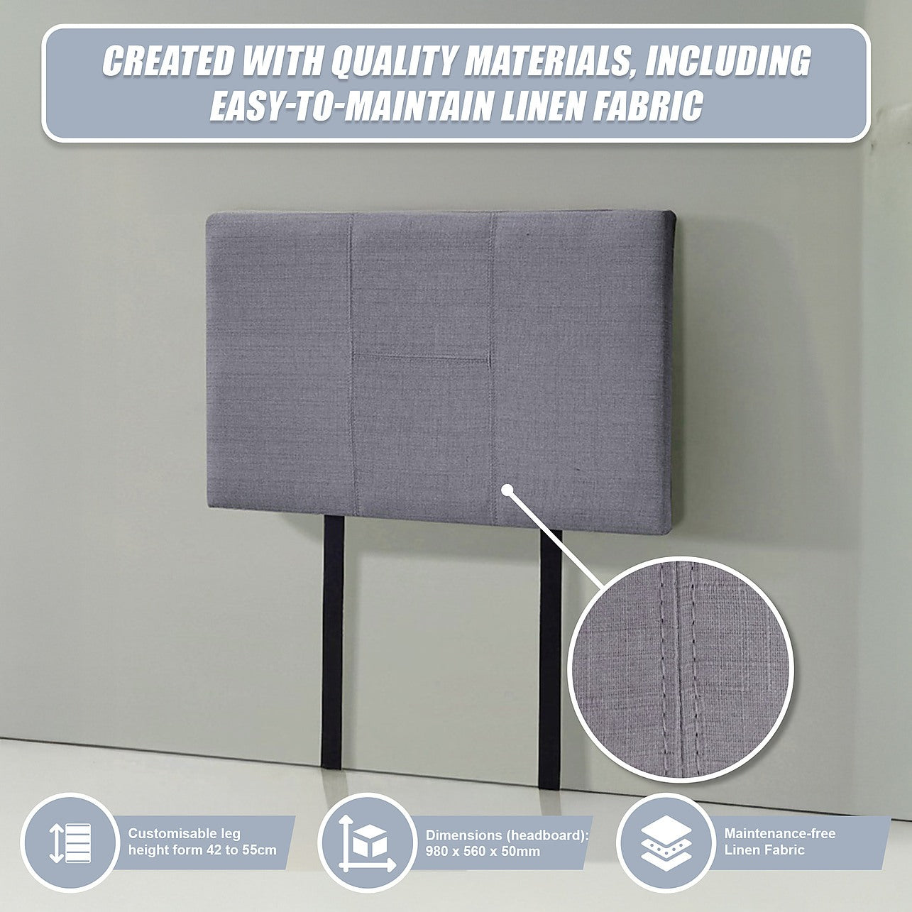 This headboard for standard Single-sized bed frames is created with quality materials, including easy-to-maintain Linen Fabric that will maintain its sophisticated look for many years to come. This particular model comes with elegant stitching accents that provide just the right level of understated pop. A neutral grey will blend seamlessly with a wide variety of bed frames and other bedroom furniture.
