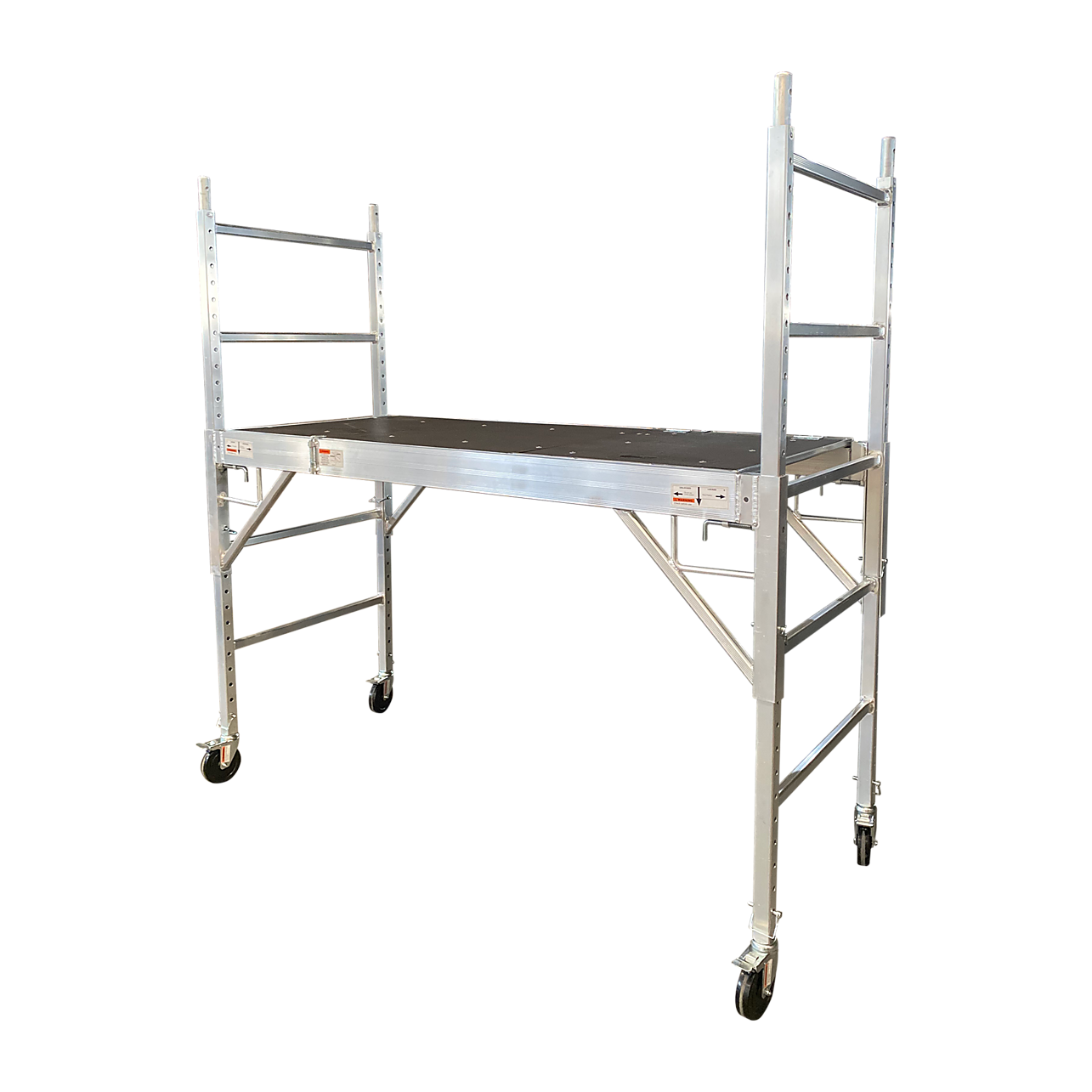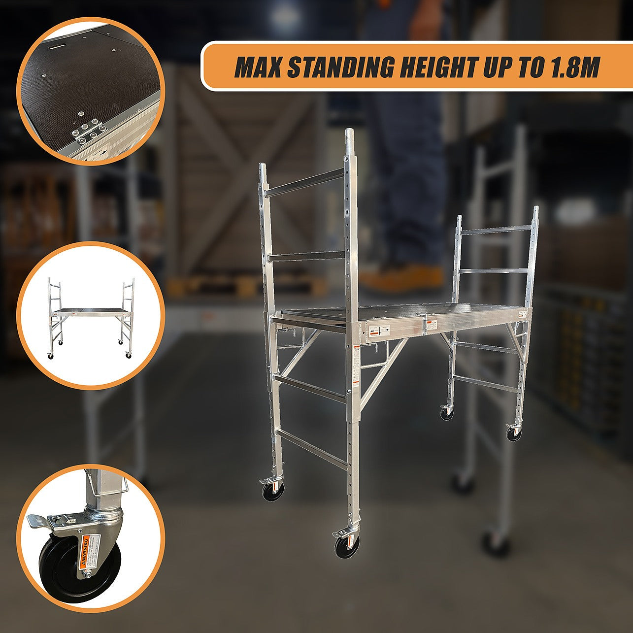 This aluminum one-level scaffold is sturdy yet its relative light weight makes it easy to move about. The maximum standing height is a generous 1.8m and the reinforced frame is HEAVY DUTY. The scaffold"s strong aluminum construction and its safety lock mechanisms are two ways in which this product adds the optimum degree of safety to those must-do chores.